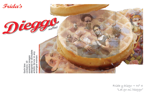 Frida’s hand rests upon Diego’s ample mid-section in the photograph superimposed on an Eggo waffle, “Frida’s Dieggo Waffled.” The other waffles feature Frida’s portrait of her sister Cristina and a portrait of arts patroness, Dolores Olmedo Patino – both among the mistresses of Diego. Copy reads: “Each box contains 10 essential images designed to stimulate artistic fervor in any wronged woman.”