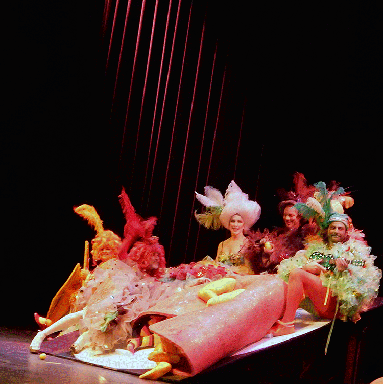 King Anchovy reigns over the colorful pageantry in the Empire Theatre. King Chris Hill arrived on stage crowned with a slice of lime and perched on his throne, “rocks” in a salt-rimmed margarita glass. As appropriate for someone who recently purchased El Mirador, Hill’s royal court was Especial Number 2. The ingredients pranced around separately before reclining on a platter to create a whole enchilada dinner. The only complaint with his court was the giant, protruding, glitter-covered jala-penis of one of King Anchovy’s attendants continually blocked camera shots, resulting in extreme camera angles (although I often shoot that way).