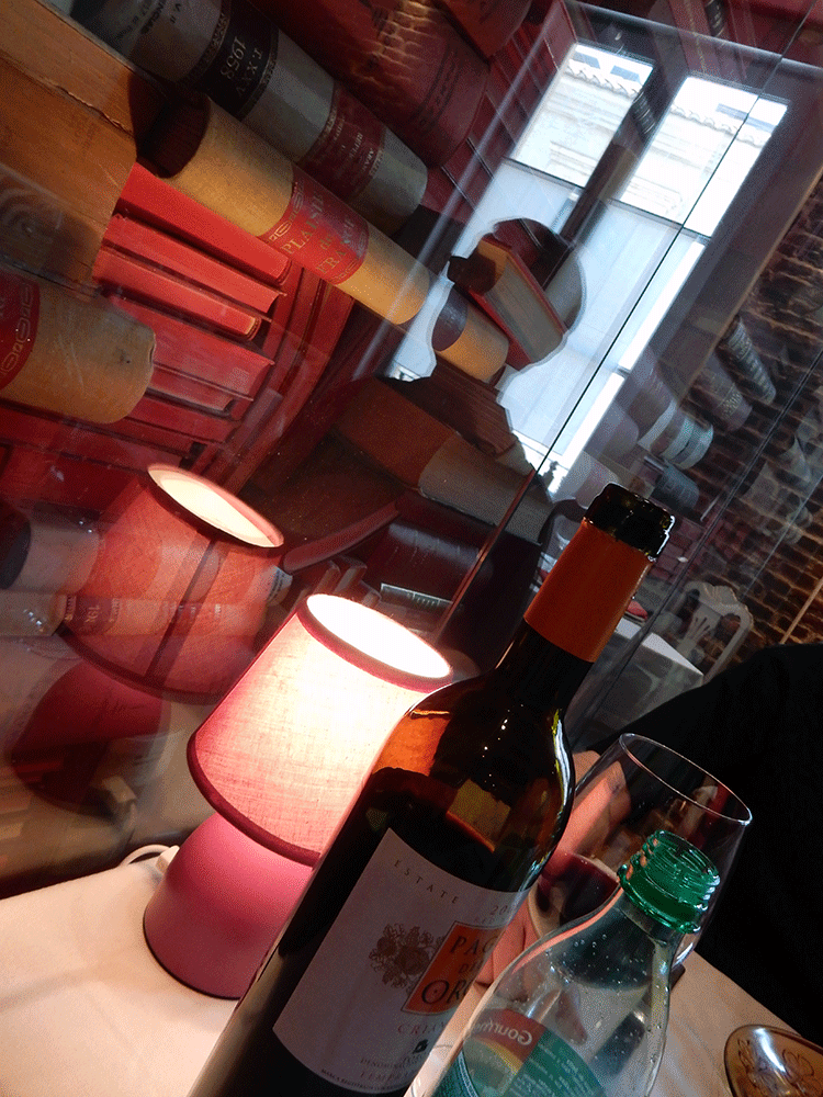 La Hoja 21 has a soothing dining room that drew us in twice. Although we rarely eat three courses at home, afternoon menu del dia combinations represent such incredible bargains in Spain. If you choose the one at La Hoja, you must remain in the front room without the linens. But you will not dine alone in exile; that seems to be where most locals eat as well. Delicate pastry tied up an appetizer of goat cheese-filled “moneybags.” Arroz con pulpo was enhanced with chunks of chorizo, and eggplant risotto was infused with the deep smokiness of wild mushrooms. Both salmon and grilled calamari arrived perfectly cooked, and the sauce of the Mister’s raba de toro (bull’s or ox-tail) was so vibrant and rich not a drop remained on his plate. What looked like an average fresh salad was filled with fluffy light cubes of wild mushroom pate. Definitely a restaurant not to miss.