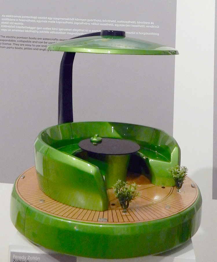 We both had our favorites. I so can picture this cheerful green cocktail pontoon lazily cruising in the Museum Reach of the San Antonio River. Or a spa or little sunbathing pontoon smoothly sailing out of a landing by Hotel Emma. The pontoon boats are electric, so they would be extremely quiet on their relaxing journeys. The collection was designed by Zoltan Peredy.