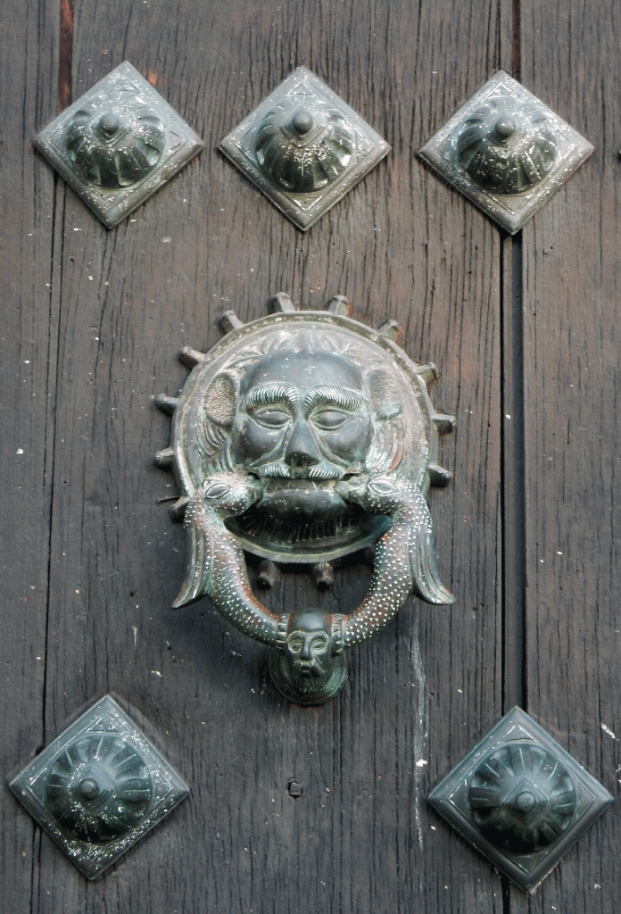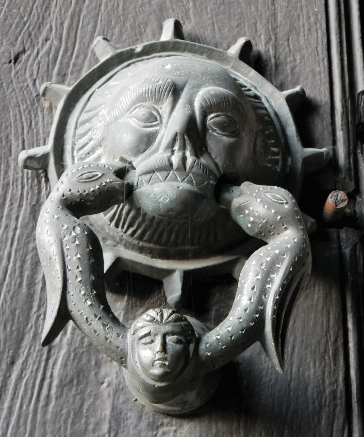 At some point, someone explained the significance of the numerous nightmarish doorknockers with lion-like faces with mouths sealed shut and fishy creatures sucking on their cheeks, but I cannot recall. We found similar figures on the door of the Metropolitan Cathedral in Mexico City.