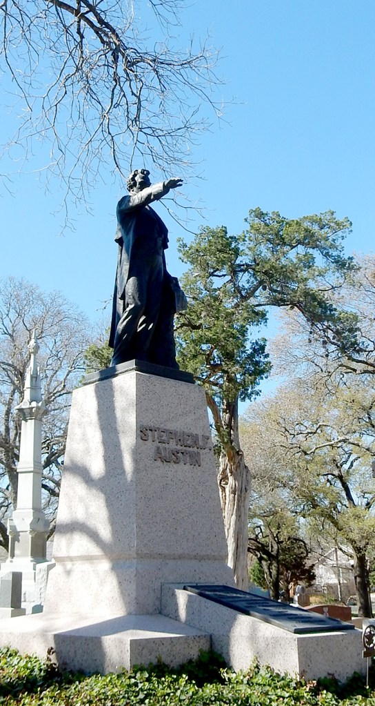 Other prominent figures from the early days of the Republic of Texas gradually were reinterred in places of honor in the Texas State Cemetery. The remains of Stephen F. Austin (1793-1836) were moved from Peach Point to a commanding spot by Governor Oscar Colquitt in 1910. The statue of him was made by San Antonio sculptor Pompeo Coppini (1870-1957), creator of the currently controversial Cenotaph in Alamo Plaza.