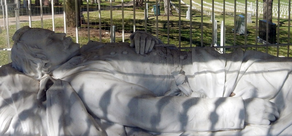 …reclines in an ornate Gothic chapel commanding over rows and rows of graves of Confederate soldiers.