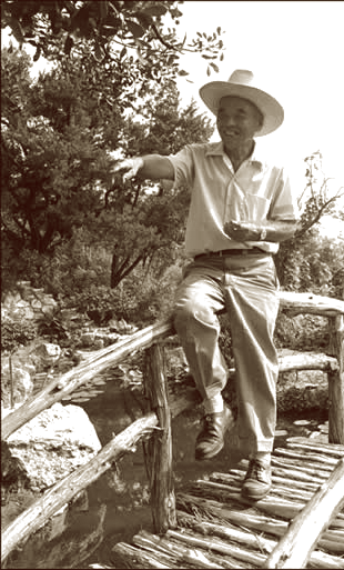 The magical part of the garden, however, is a three-acre tract overlooking downtown that a volunteer transformed into a peaceful oasis, the Oriental Garden. Isamu Taniguchi was born in 1897 in Osaka, Japan. In 1915, he moved to Stockton, California, and made his living as a farmer. During World War II, he and his family were removed to Texas and detained in the camp at Crystal City (Learn more about this experience from Jan Jarboe Russell’s article in Texas Monthly).