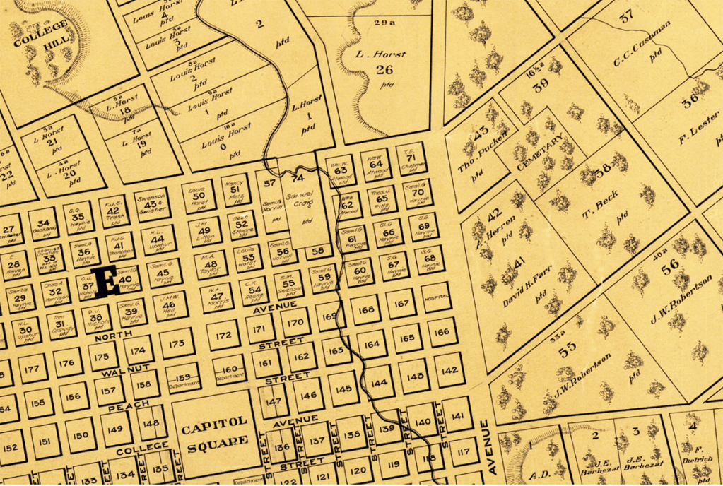 College Hill on the top left of the map above is surrounded by property owned by Louis Horst. Born in Germany, he and his wife Margarette first landed in New Orleans in the 1830s. The butcher settled in Austin, and most of his former plantation is now home to the University of Texas.