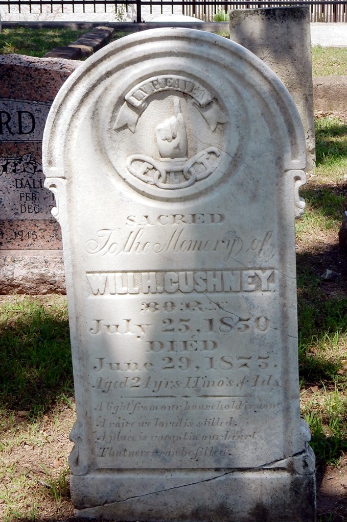“A light from our household is gone. A voice we love is stilled. A place is vacant in our heart that never can be filled.” Those words express a young widow’s mourning for Will Cushney, the son of a printer and founder of Local 28 Typographers Union. He survived a several month stint as a Texas Ranger in 1870, but somehow death overcame him while on a trip to Covington, Louisiana. The pointing finger clearly indicates his arrival in heaven. The letters F L T linked together in a chain stand for friendship, love and truth – a motto of the Independent Order of Odd Fellows.