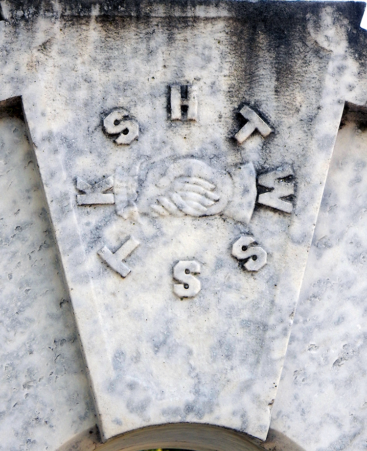 But of particular interest is the keystone in the arch of their shared headstone. The clasped hands indicate their marital bonds and the couple’s reunification in heaven. But the mysterious initials – H T W S S T K S? According to author Tui Snider, they represent an acronym associated with Royal Arch Masons: “Hiram, Tyrian, Widow’s Son, Sent to King Solomon.” According to Wikipedia (sorry), Hiram Abiff is the central character of an allegory presented to all third-degree Masons. “The chief architect of King Solomon’s Temple is murdered inside this temple by three ruffians, after they failed to obtain from him the Master Masons’ secret passwords. The themes of the allegory are the importance of fidelity and the certainty of death.”