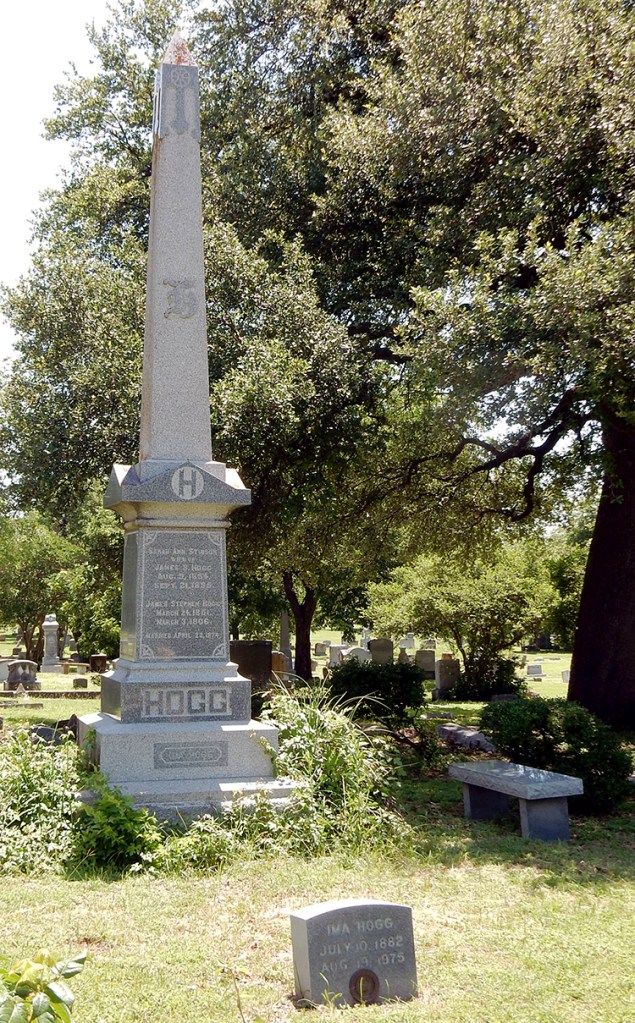Whoever commissioned his obelisk failed to take note of that request, and the closest tree appears to be a live oak. Instead of a walnut tree at his foot, the daughter cursed with a name that always sent schoolchildren snickering yet blessed with a major inheritance – Ima Hogg – rests there. Ima proved a major Texas philanthropist. Among her credits are the establishment of the Houston Museum of Fine Arts and the gift to the state of the Varner-Hogg Plantation. Still globe-trotting in her nineties, she died from injuries suffered during a traffic accident in London.