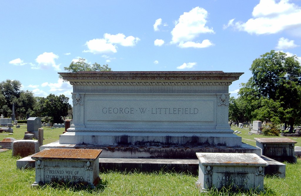 Not sure George Washington Littlefield ended up with his chosen gravesite exactly as he planned either. The marker is prominently placed on the northern side of the cemetery, an address on 11th street which led westward toward the university he cherished. The former major of the Confederacy fretted his entire life about preserving the southern way of life and the system of values he felt it contained. After amassing a fortune from cattle ranching, Littlefield donated more to the University of Texas than any other individual during its first 50 years of existence. Several of his contributions had strings attached, such as his insistence the university remain across the street from his home instead of moving to land donated by San Antonian George Brackenridge. In order to ensure students did not fall under the influence of professors educated in the north, Littlefield established a major fund to support and promote Southern History portrayed in the fashion he deemed accurate. His spirit might not rest as comfortably now that the address of his gravesite was changed to Martin Luther King Drive.