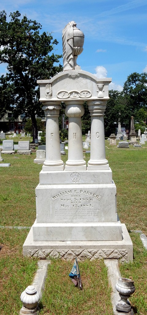 The horse of Colorado Fire Company No. 2 was draped with emblems of mourning after its president unexpectedly died, possibly in the line of duty, in May 1884. Among those gathered at the home of William Edgar Parker on Bois d’Arc and East Avenue were all 130 members of the fire department, 20 Knights of Honor and 25 members of the Milam Lodge of the Independent Order of Odd Fellows, according to the Austin Statesman. Their symbols adorn his headstone, with a heart in hand representing his charitable nature. But this heart is placed upside down. Perhaps that symbolizes his sudden unexpected departure?
