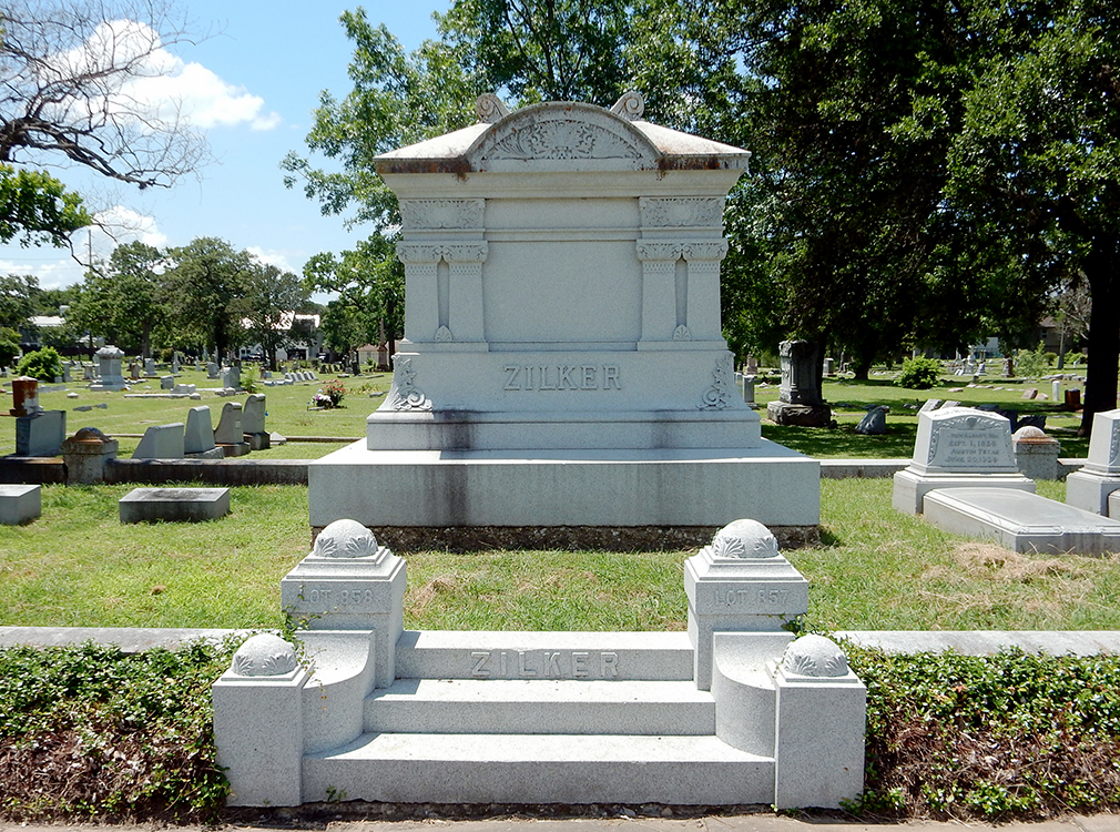 On the other hand, Andrew Jackson Zilker, whose background is related in an earlier post, probably remains satisfied with the location of his family plot. It faces the Main Street of the cemetery, a street providing a splendid protected view of the dome of the Texas State Capitol, where the flags flew at half-mast when he died.