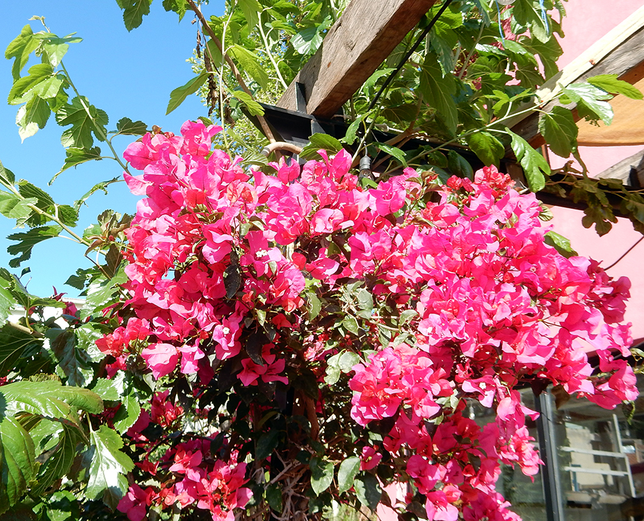Above, La Bufa framed by bougainvillea blooming on the patio of our rental
