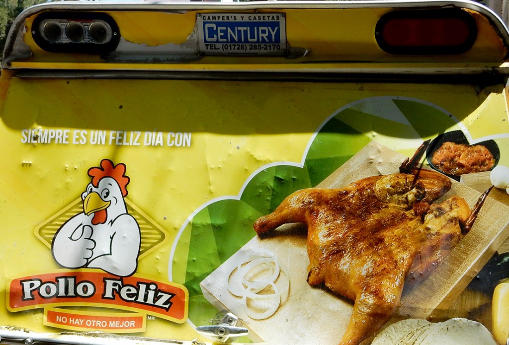 A neighborhood landmark is the smokestack always churning away to roast whole chickens for the seemingly inappropriately named Pollo Feliz. Yes, the rooster spared from the spit to serve as the mascot appears happy, but the chicken on the right? Not so much.