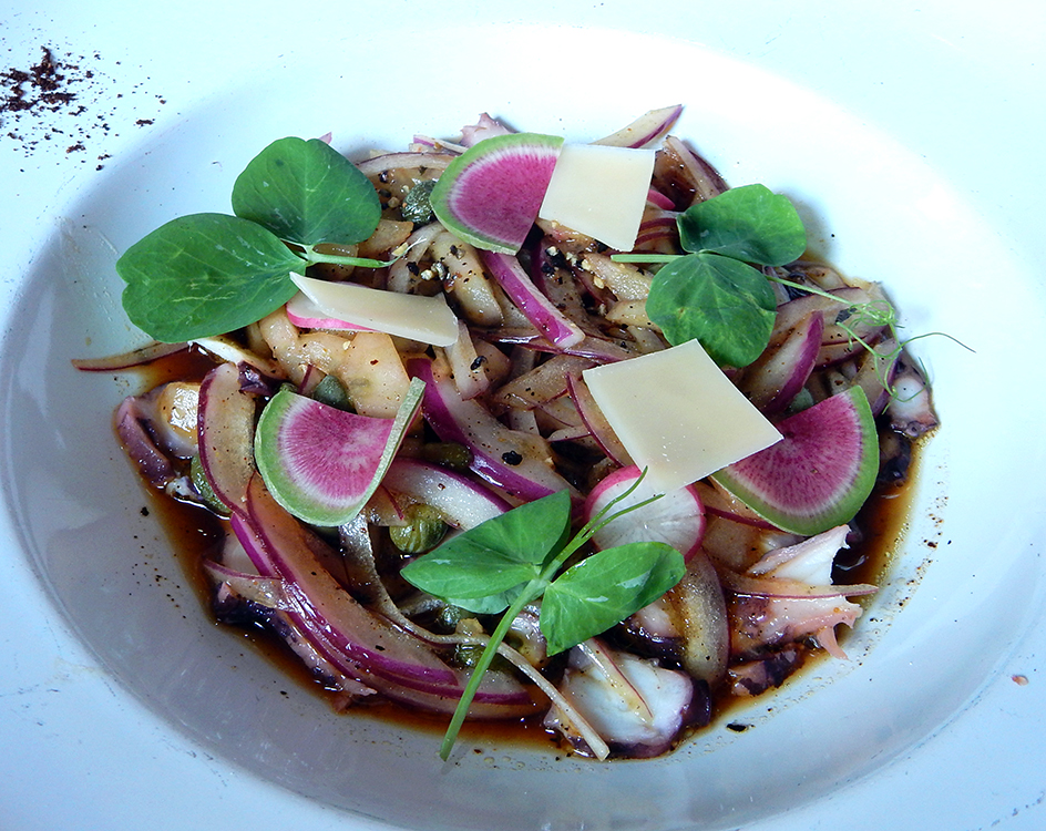 Mestizo carpaccio de pulpo con xoconostle y polvo de chiles secos