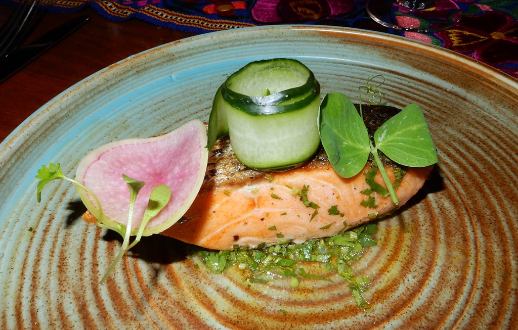 Mestizo salmon a la parilla reposado en hierbas de la casa, jengibre y limon eureka