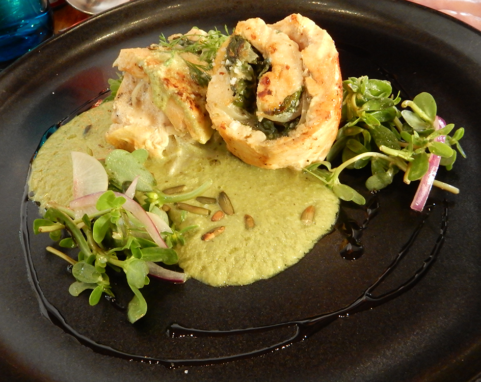 Costal Cultura rollo de pechuga relleno de espinacas y queso de cabra en salsa pipian