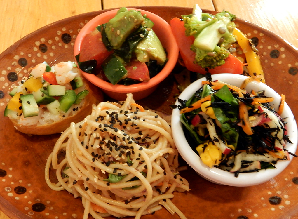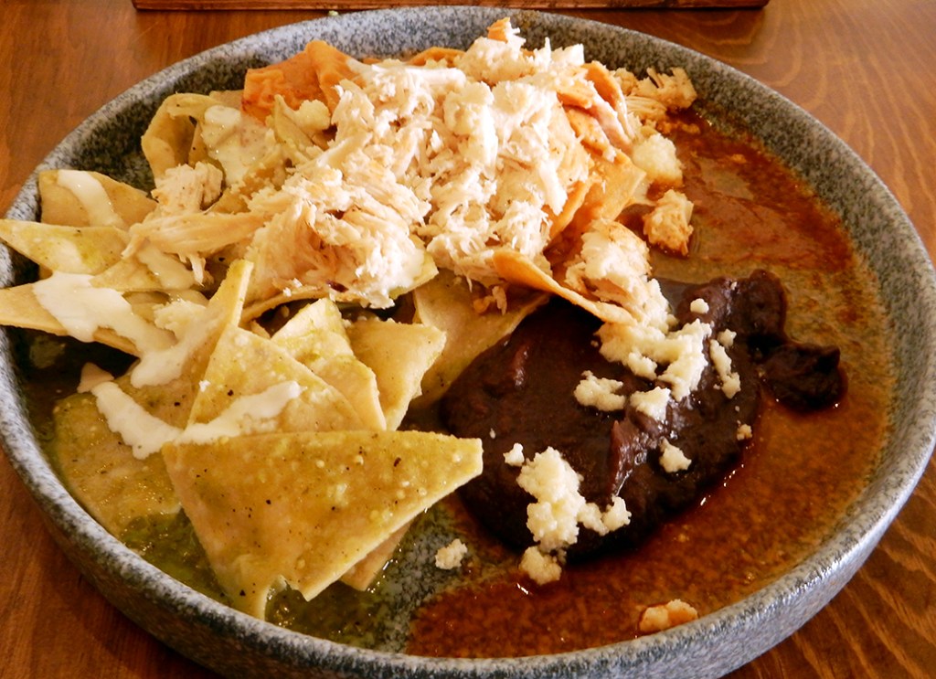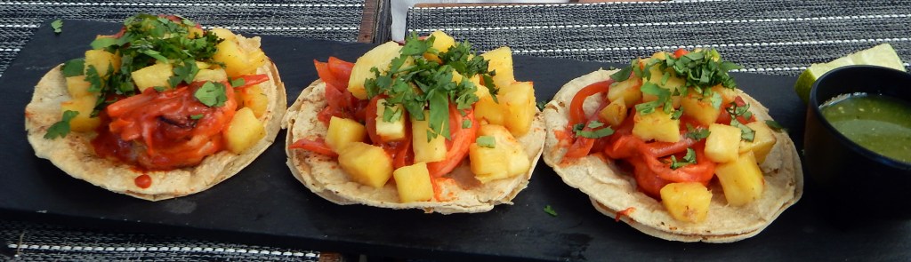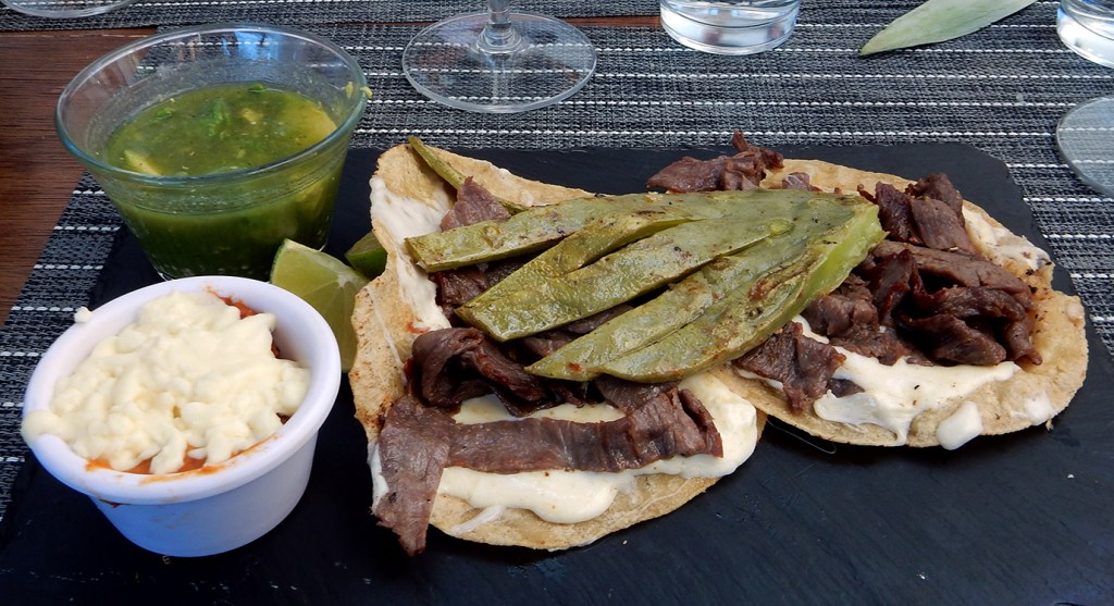 We had mourned the loss of Le Midi in Guanajuato, but were pleased to find a tasty newcomer had filled its lofty upstairs quarters – Costal Cultura Cafetera. Place an order for their croquetas while pondering choices. Both the tacos filled with tender octopus and the ceviche tostadas made great starters. The two variations of ancho chiles rellenos were rich in flavor, one filled with a ground beef mixture and the other with corn and cheese. The shrimp topping a salad with mangos were not abundant, but were perfectly cooked, and the chicken breast filled with spinach and goat cheese was flavorful and moist.