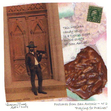 Flip side of above postcard: “The Mexican Candy seller is a typical sight on the streets of San Antonio. Dressed in his native garb and selling a kind of pecan candy peculiar to Mexico which he alone seems to have the secret of making more toothsome than anyone else.”