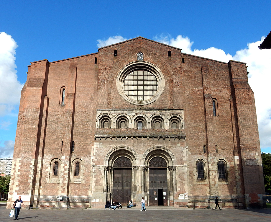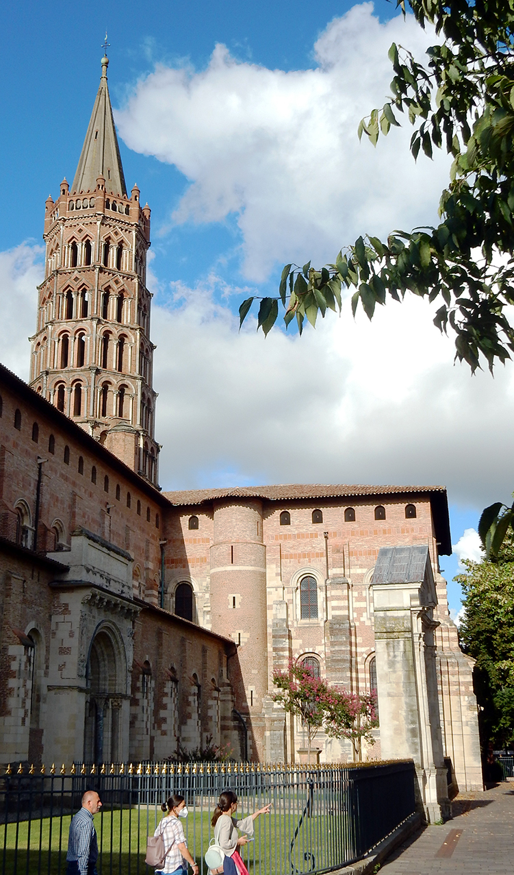 One of the best ways to fully appreciate a medieval church is to stroll around its exterior. Indeed, during this circumnavigation, one is not only transported back in time, but also through time. It often took centuries to construct churches of the size and scale of Saint-Sernin. By walking around the exterior of these churches an observant visitor can clearly see shifting architectural styles and changing sculptural aesthetics. Although construction was begun on Saint-Sernin by about 1080, slight changes in the proportion of brick and stone used during the course of its construction suggest the church went through a number of different building campaigns from its genesis until its ultimate conclusion, perhaps as many as four. Romanesque (and Gothic) churches are often a negotiation between what was dreamed and what came to pass; the final church often looks different from its original architectural plan.