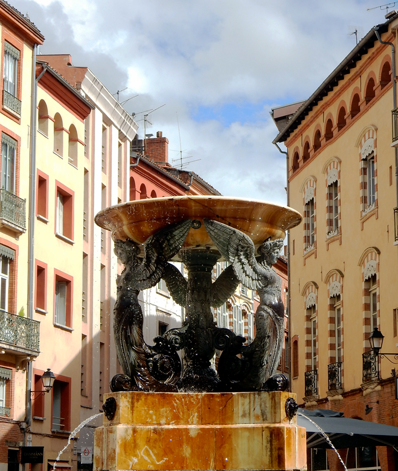 The featured photo at the top is of my favorite plaza, Trinity, reconfigured in the early 19th-century by the city’s architect, Jacques-Pascal Virebent (1746-1831). Virebent’s stamp on the city was enduring, an example being the Place du Capitole, a space he actually opened up to create more uniformity by tearing out some medieval residences hemming in the Capitol. While the Place du Capitole impresses by its size, my preference by far is his Trinity Plaza, Crayola-colorful and remarkable because of the intimacy provided by its triangular shape. The restaurants and cafes found on it always have packed patios, several attracting primarily seniors from the neighborhood undeterred by others appealing to crowds of university students. The fountain design was chosen competitively, with the winner Urbain Vitry (1802-1863), the architect for Les Abattoirs the blog visited earlier.