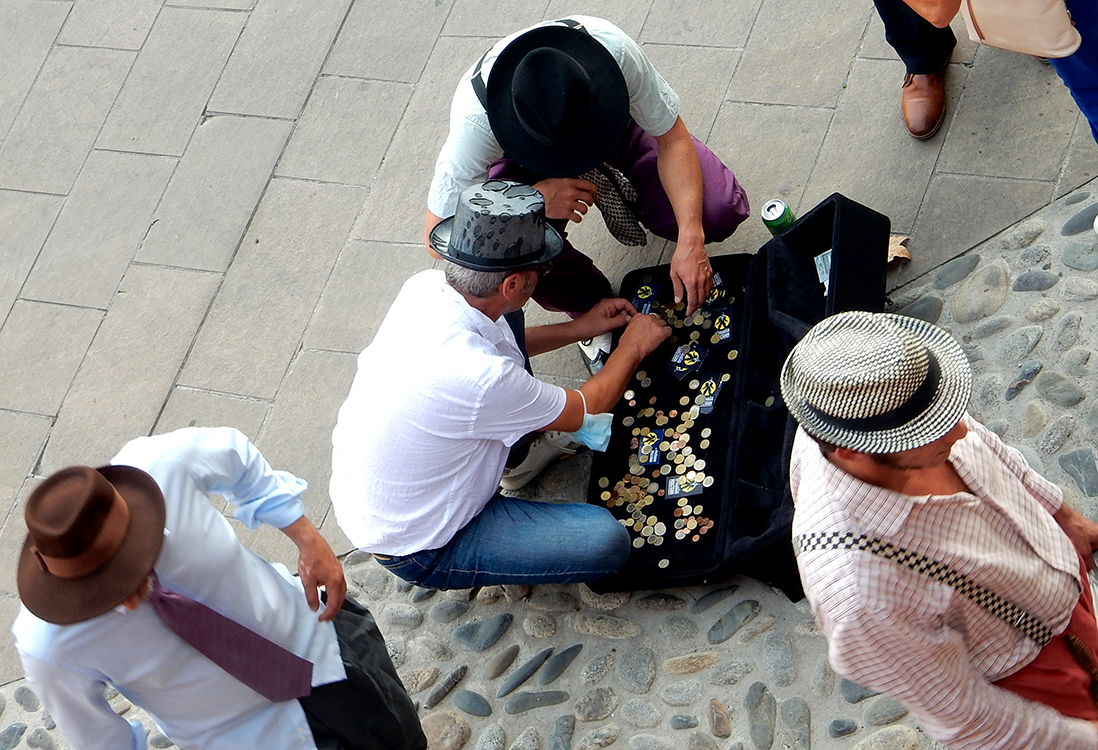 …and a band of street musicians divvying up their tips after performing alongside the River Garonne.
