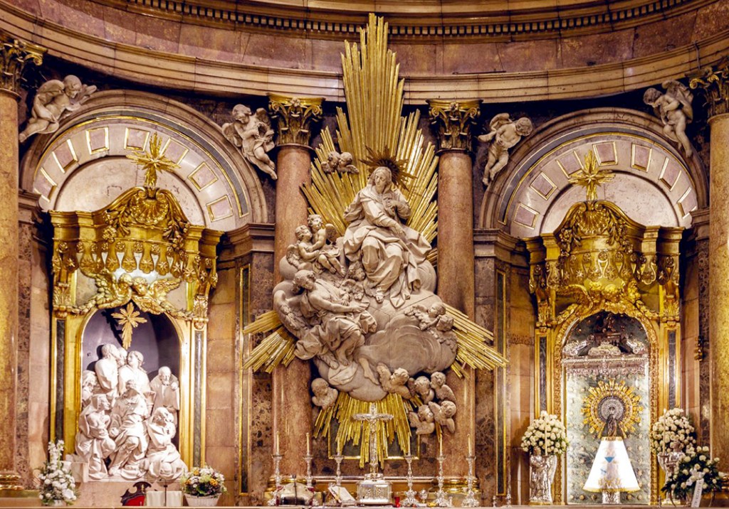 Today’s enormous Baroque-style church, La Basilica del Pilar, was begun under the reign of Charles II of Spain (1661-1700), shortly after the co-cathedral truce was reached. It encompasses the chapel, refashioned in 1754 and dedicated to the Virgin Mary, la Santa Capilla de Nuestra Senora del Pilar.