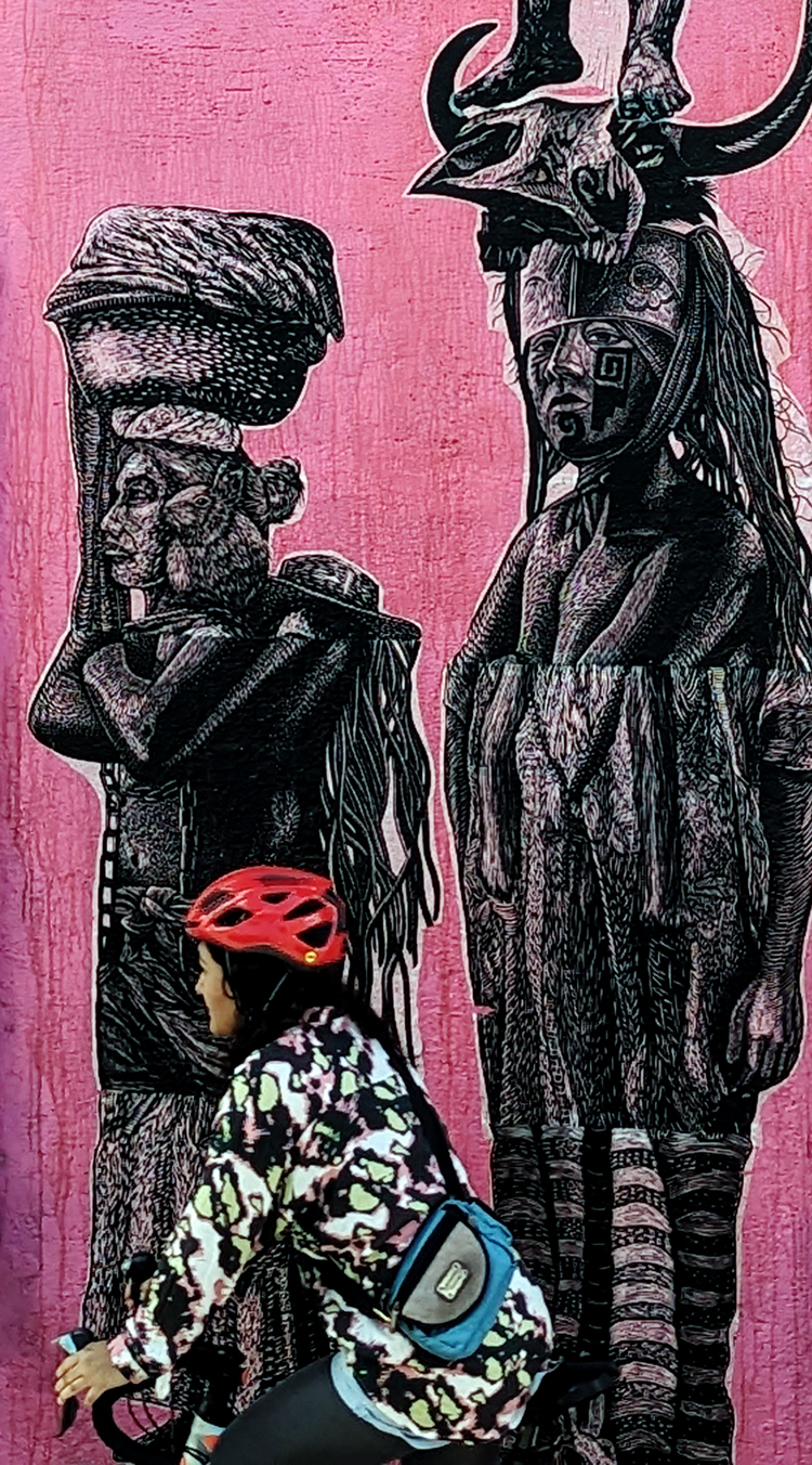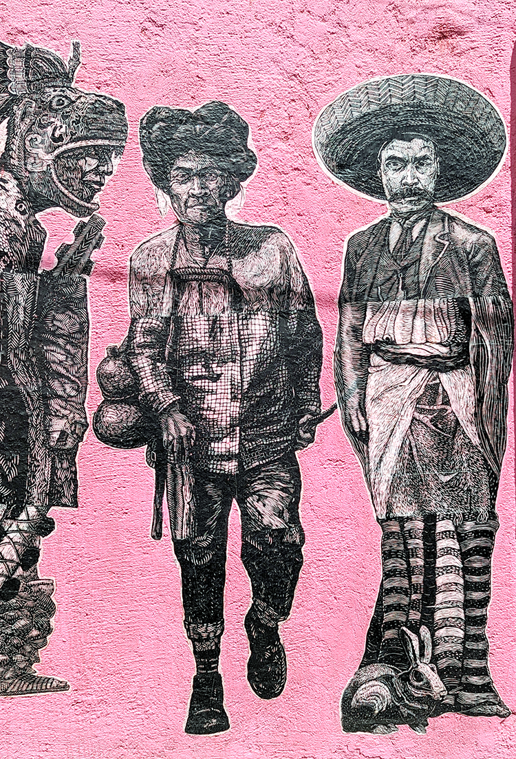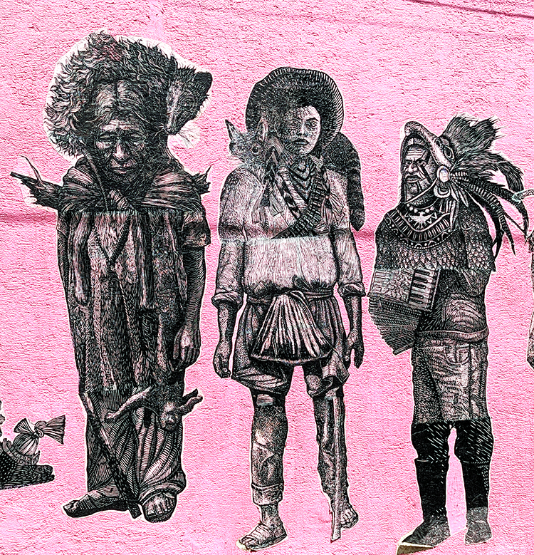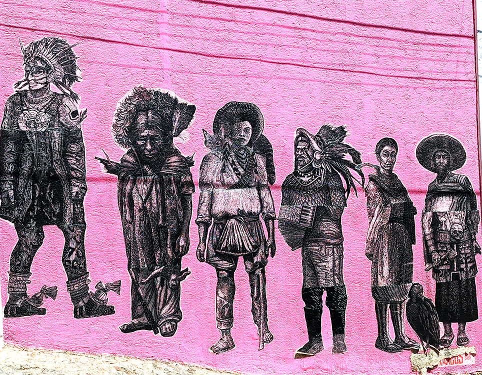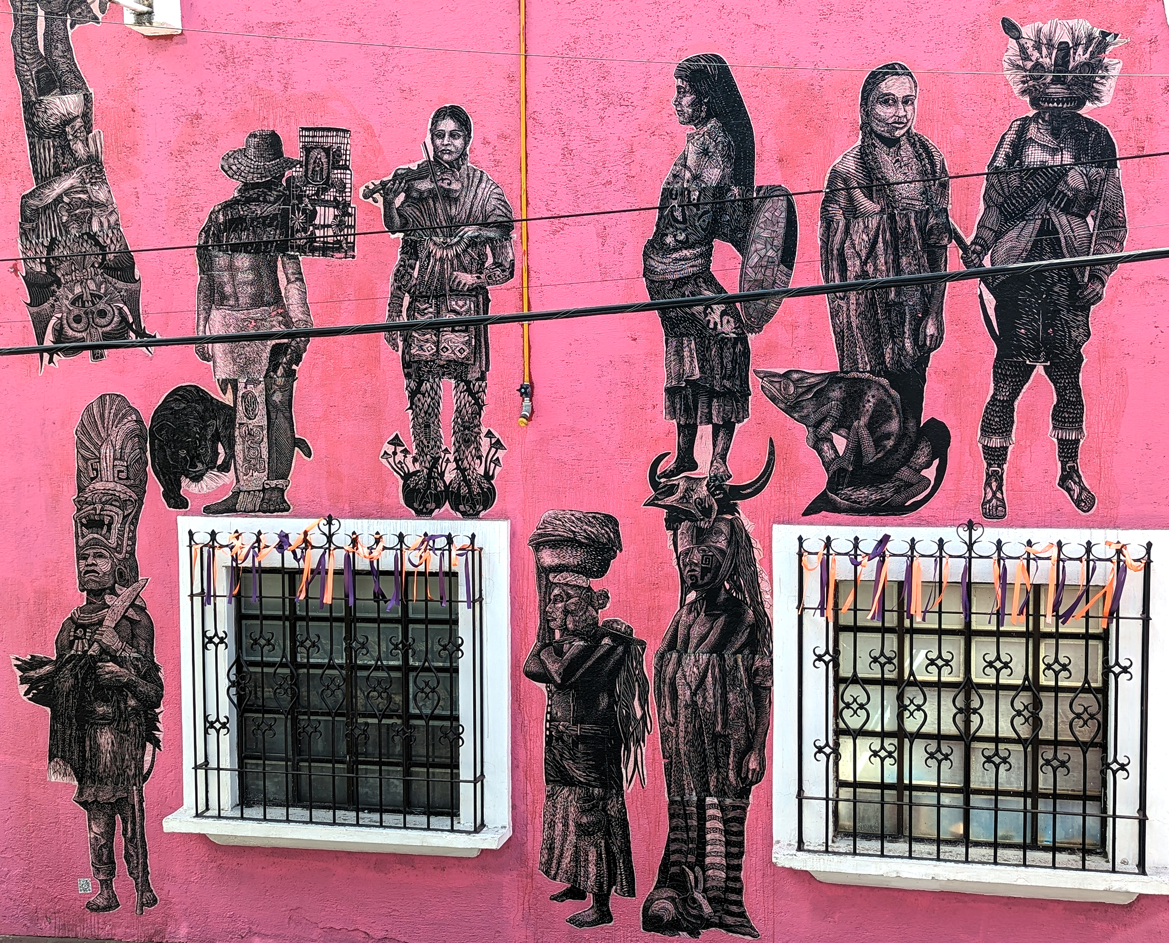 The one-story building at the corner of Calle Jose Lopez Alavez and Calle Bolanos Cacho, Barrio de Xochimilco, was a deep burnt red color until a team of enthusiastic artists armed with rollers gave it a new coat of deep pink this fall. They quickly papered the rough stucco canvas with a series of large, exquisitely detailed woodblock prints the young artists created as part of Colectivo Subterraneos.