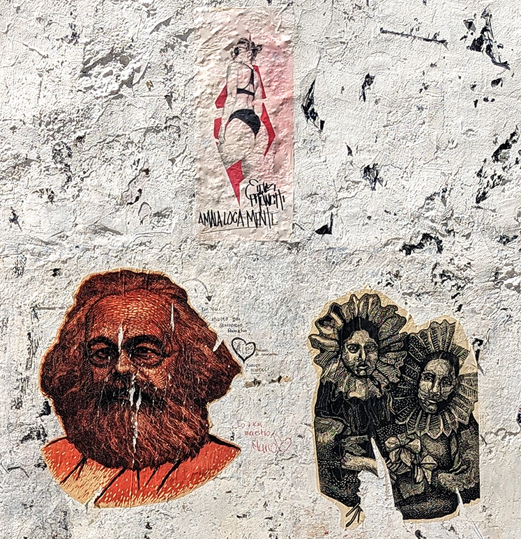 Unlike the scrambled mix-and-match style of the figures on the pink structure, most of these “Nobodies” are privileged enough to have retained their own original bodies. Prints of slaves also plaster buildings, images so powerful that Gord Goble described them in Penticon Now as both beautiful and terrifying portrayals of “man’s inhumanity to man.”