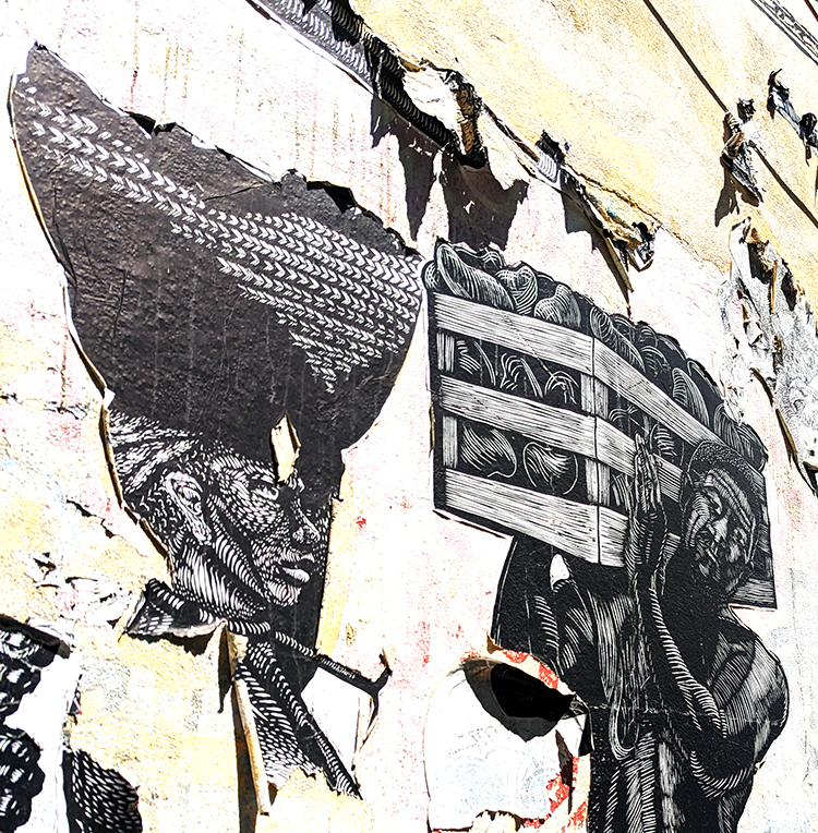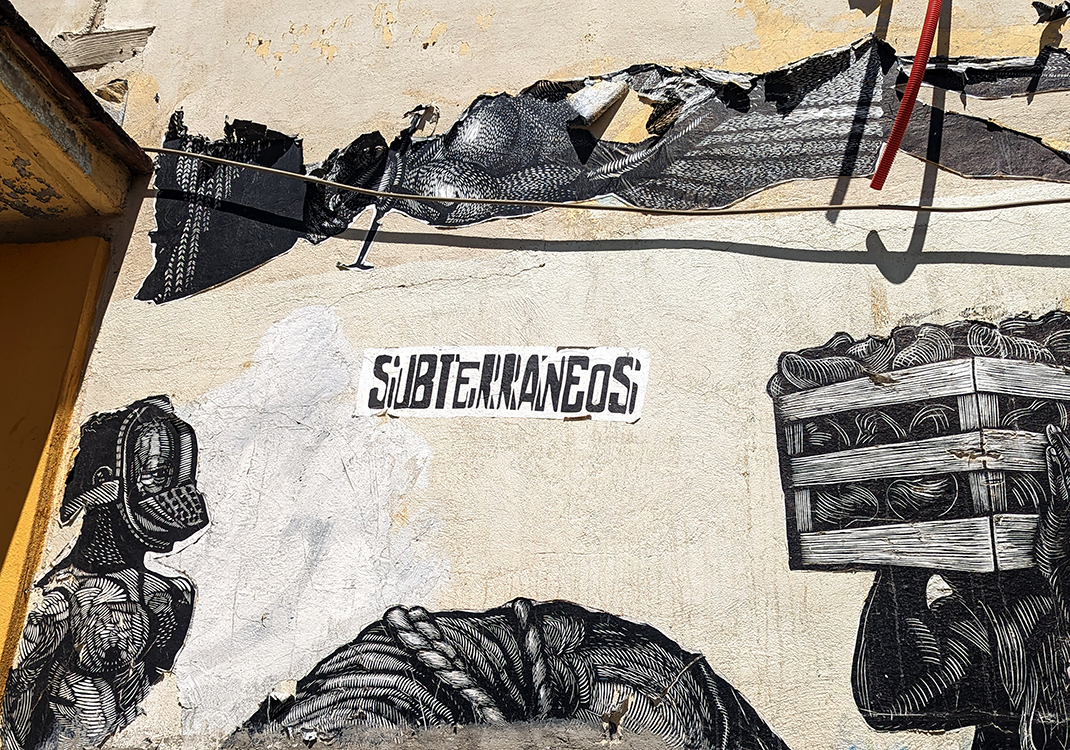 Above: A haunting image of a tightly bound slave on his side at the bottom of a wall is one of many works emerging from the Colectivo Subterraneos.