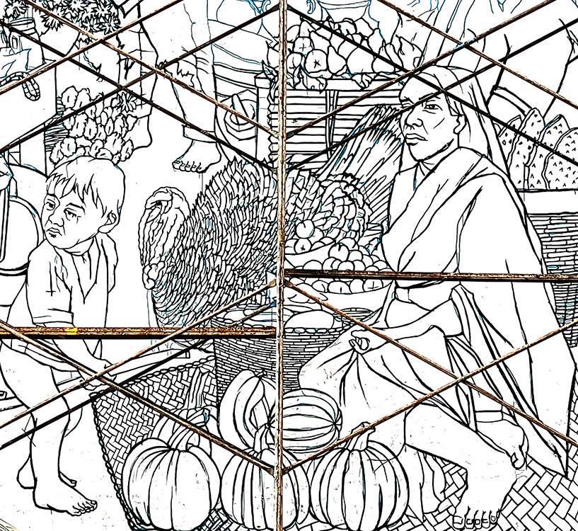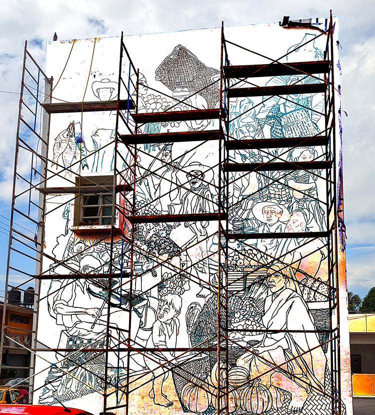 While we were in Oaxaca, after careful planning and with incredible speed Colectivo artists sketched out the drawings below to mark the 50th anniversary of Mercado de la Merced. The colorful bottom photo was posted by Subterraneos; the mural was dedicated on March 1.