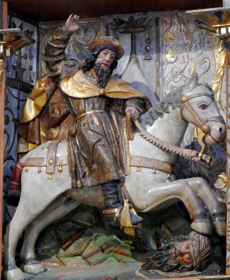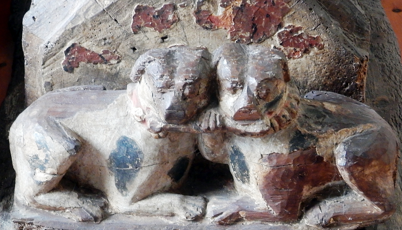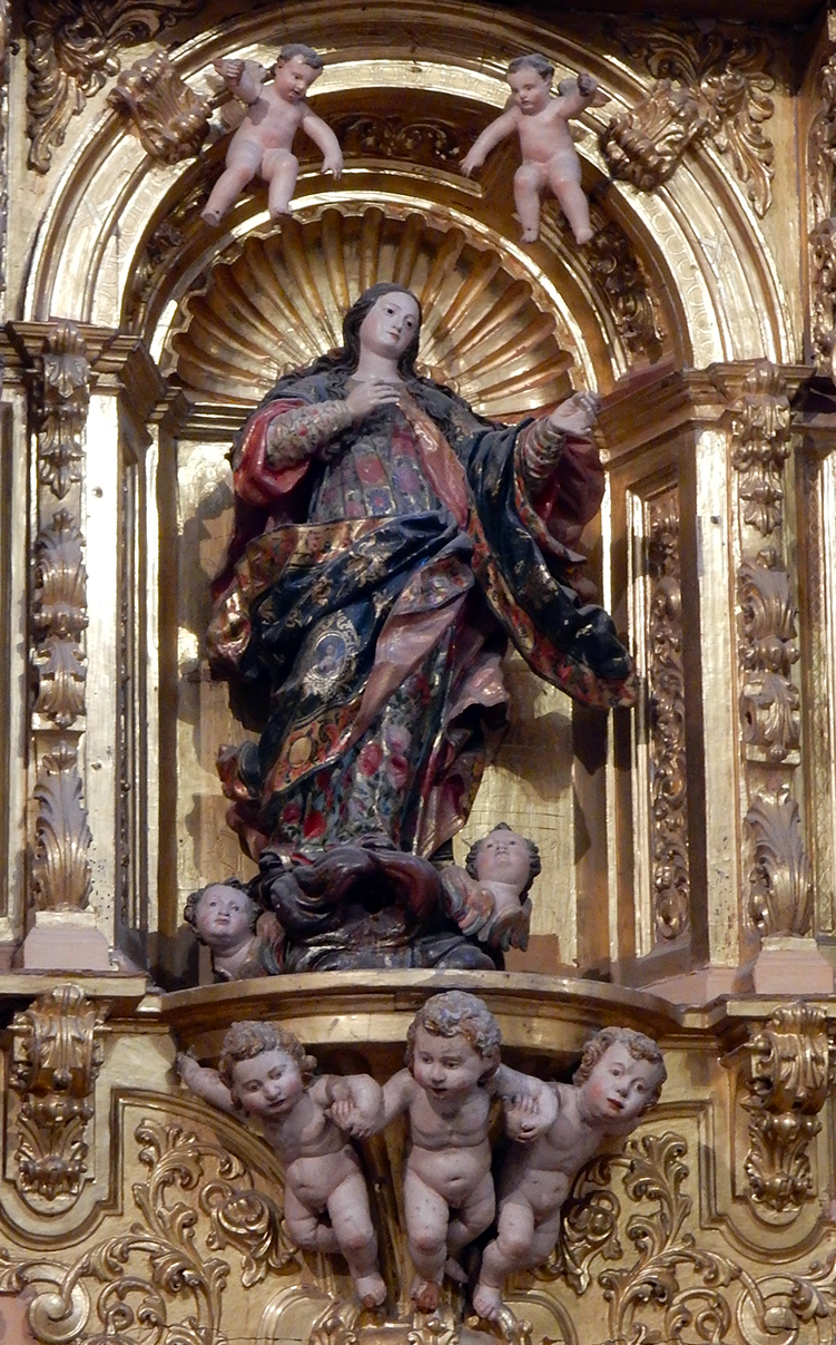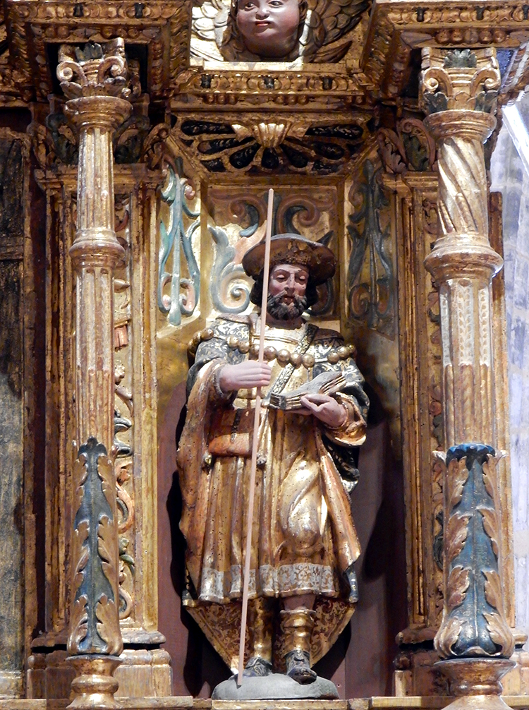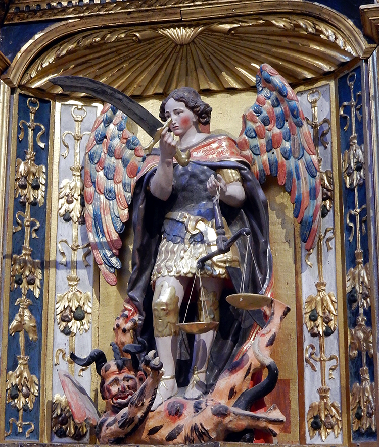 “Footnotes:” Often in religious art, the most interesting parts are found underfoot, as demonstrated above. Hardworking putti keeping saints aloft. Dogs guarding their royal master for eternity. Slain Moors under Santiago. A defeated king at the mercy of a sword-bearing queen. A spotted devil trampled upon by San Miguel. And that chained, horned, goat-like devil with a strong underbite and extra faces on his knees and hindquarters begging for mercy at the feet of I know not what saint. And outside, there was a nest full of offspring under the watchful eye of their mother stork. And it would prove fortunate I like looking down as my sensitivity to light increased over the days to come.