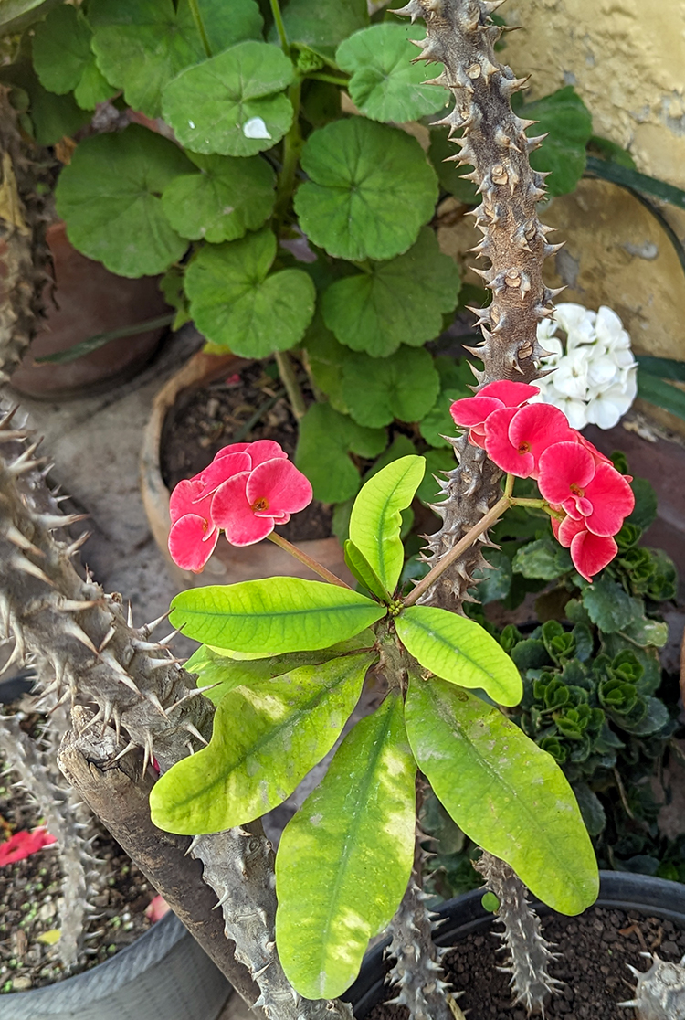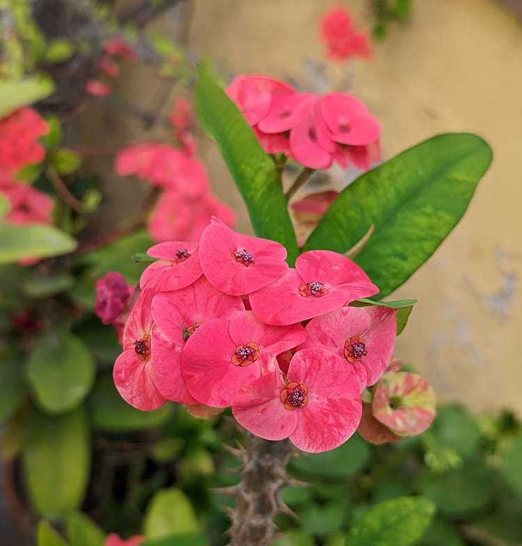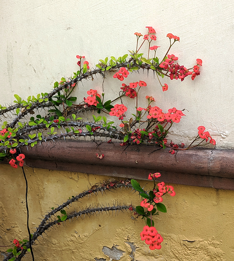 Ah, but those vicious needles of las coronas de espinas, or crowns of thorns, kept me on high alert as I carefully threaded my way back to the guestroom on post-Tequila, conversation-filled evenings. But it’s impossible to ignore the beauty of their blooms amongst the thorns.