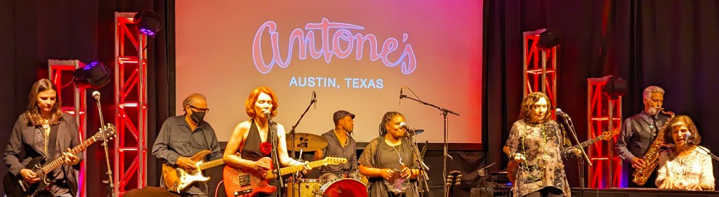 Antone’s always has been supportive of women blues singers and five of them made an incredible line-up of blues talent for the show that will be broadcast later by Songwriters across Texas. Emcee Zach Ernst, a musician and band-booker for Antone’s, briefly interviewed each of the women before they took the spotlight. All mentioned how much the lively community of artists in Austin aided their careers, with Antone’s at its hub. Here, musicians serve as kindred spirits nurturing one another, not as fierce competitors.