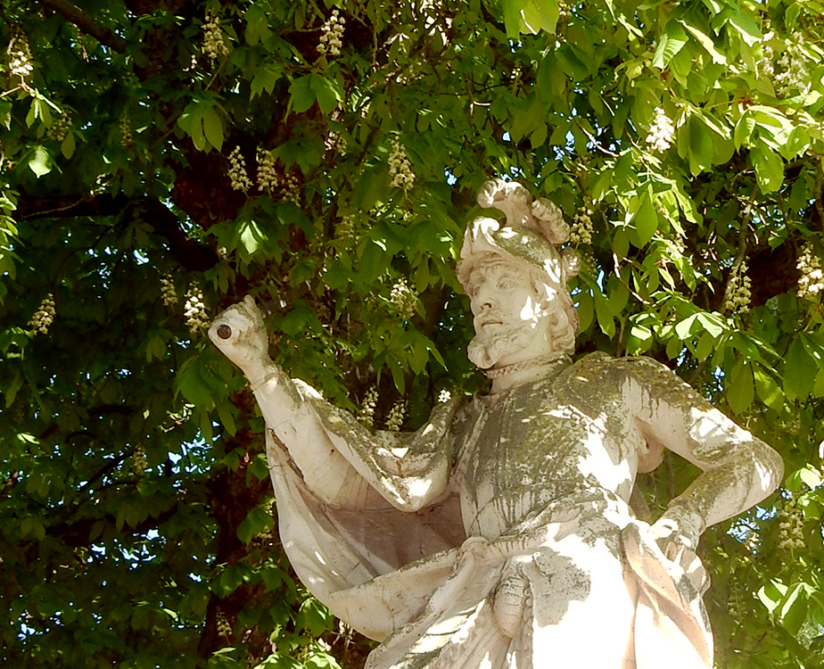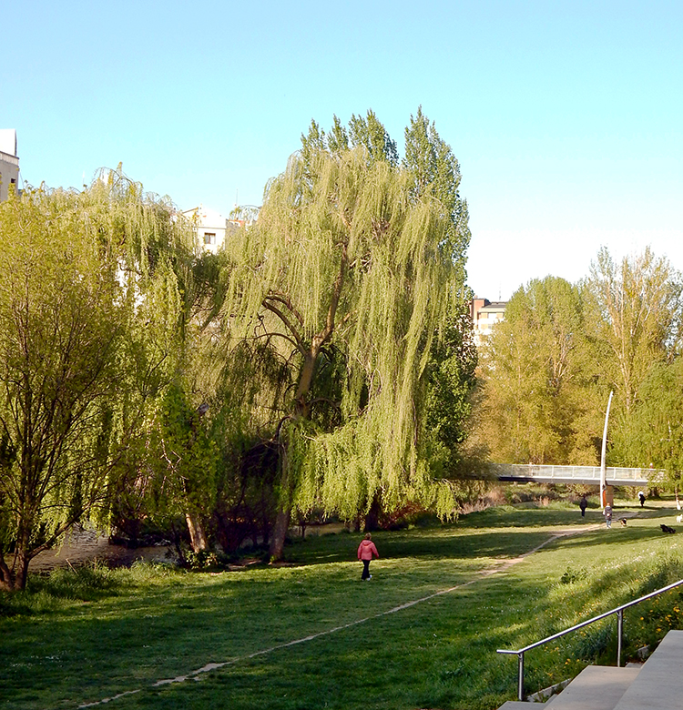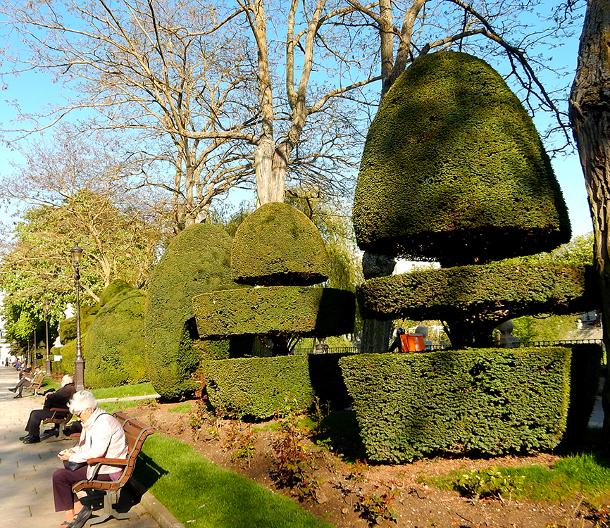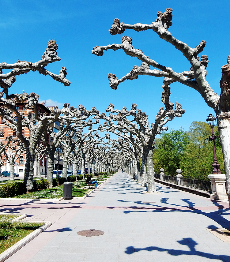 Remove the brilliant blue sky from the picture, and these trees appear as frighteningly eerie as those in The Wonderful Wizard of Oz. The severe winter haircut, pollard, of these relatives of American sycamores lining Burgos’ beautiful Paseo del Espolon reaps a huge reward for pedestrians. The trimming encourages the trees to produce a dense canopy of green leaves shading all who pass below throughout the summer, and whimsical-shaped topiaries soften the impact during the winter months.