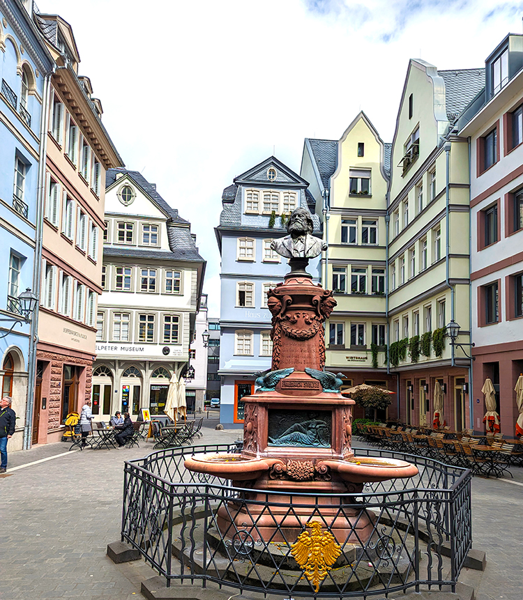 Frankfurt is the birthplace of Johann Wolfgang von Goethe (1749-1832), a bust of whom is at the center of one of the plazas pictured above. In 1786, abruptly departing his mistress at the time, Goethe headed to Italy.