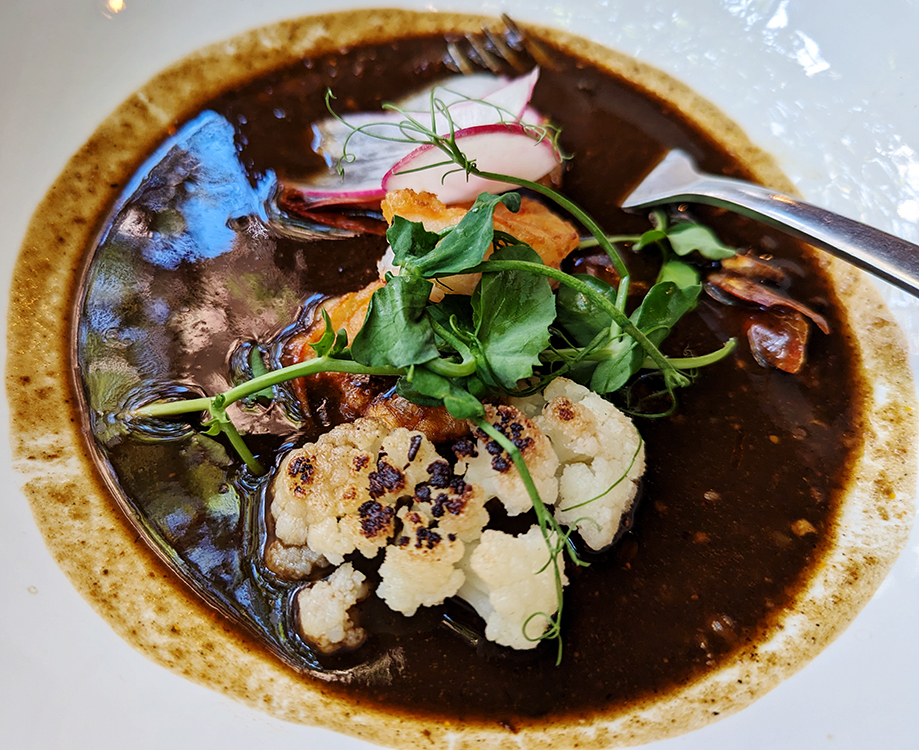 The Mister ordered a trio of indigenous moles: amarillo, verde and cequeza, which the menu translate to “blindness” mole made from “broken corn.” I placed all my eggs in one bowl so to speak, opting for shrimp mounded in cequeza mole with roasted cauliflower. Unlike the Oaxacan moles we have experienced and loved throughout the years, we found both the yellow and green moles watery and relatively flavorless to our tastebuds. And the cequeza? Oh dear, it did not suit us at all. Its primary flavor seemed black ash. It was more soup-like than sauce-like, with no spoon provided and none wanted. Shrimp and cauliflower could not save the dish for me.