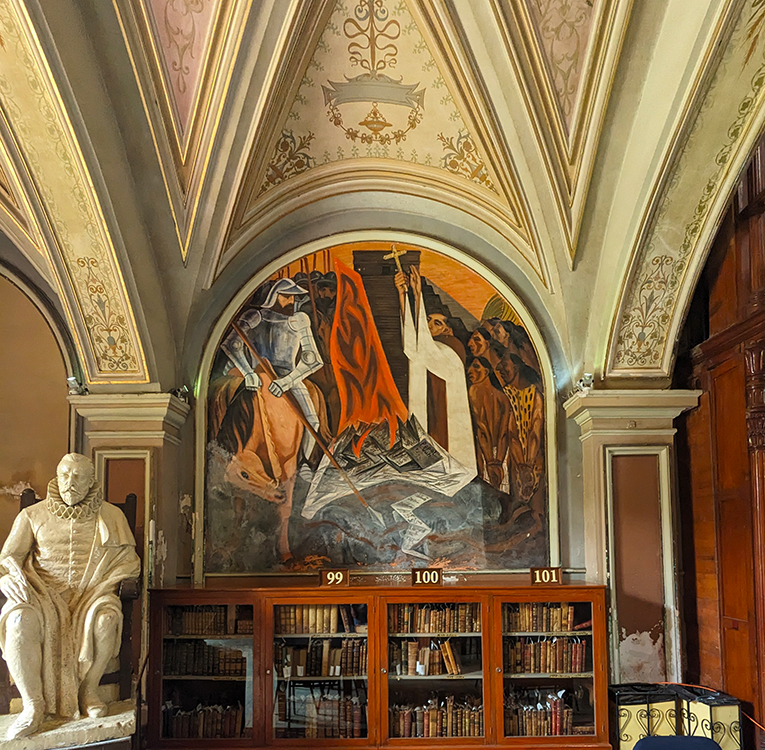 Murals by four artists were added to the Public Library of Michoacan University in the 1950s. Surprisingly, three were by artists from the United States: Robert Hansen (1924-), who studied under Alfredo Zalce at the Bellas Artes in Mexico City; Hollis Holbrook (1909-1984); and Sheldon Schoneberg (1926-), whose graduate work included a stint at Universidad Michoacana studying frescos in 1952. The sole Mexican artist, Antonio Silva Diaz, is known for his part in designing Morelia’s 1931 landmark fountain, Fuente de las Tarascas. I have absolutely no idea which artist painted the murals pictured below, but the library represents a handsome adaptive reuse.