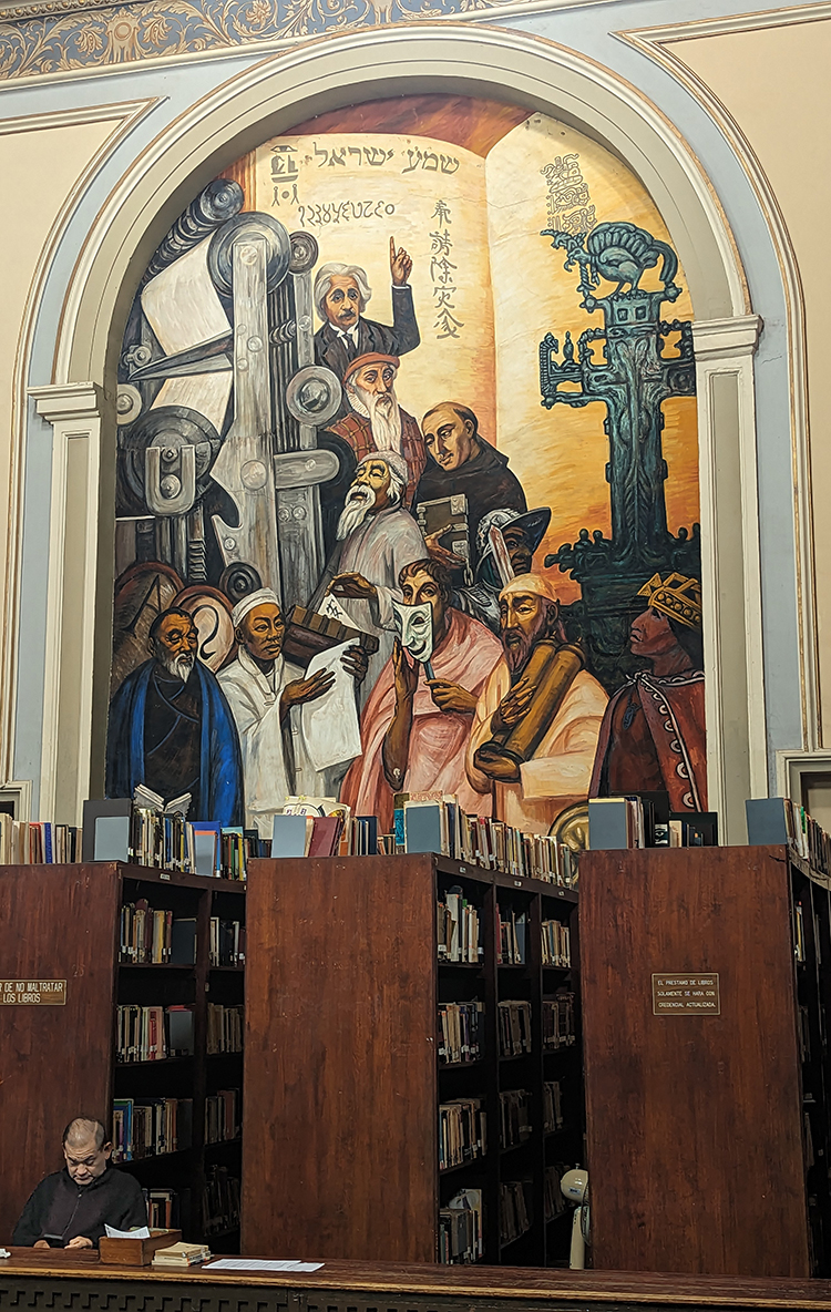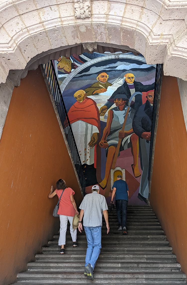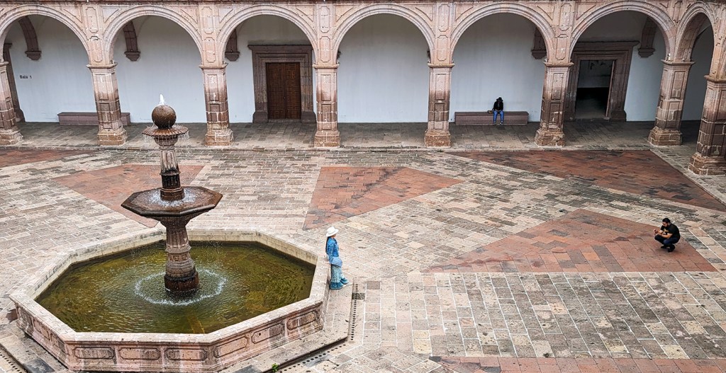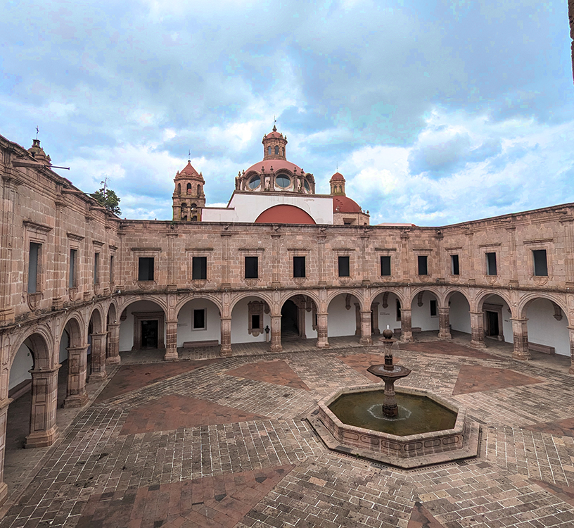 In 2008, the ex-convento and former school were renovated under the direction of architect Ricardo Legorreta to serve as the home of the Clavijero Cultural Center. The most striking addition to the center is a 2002 mural in a domed stairwell, “Mountains of Michoacan” by Michoacan-born artist Adolfo Mexiac (1927-2019).