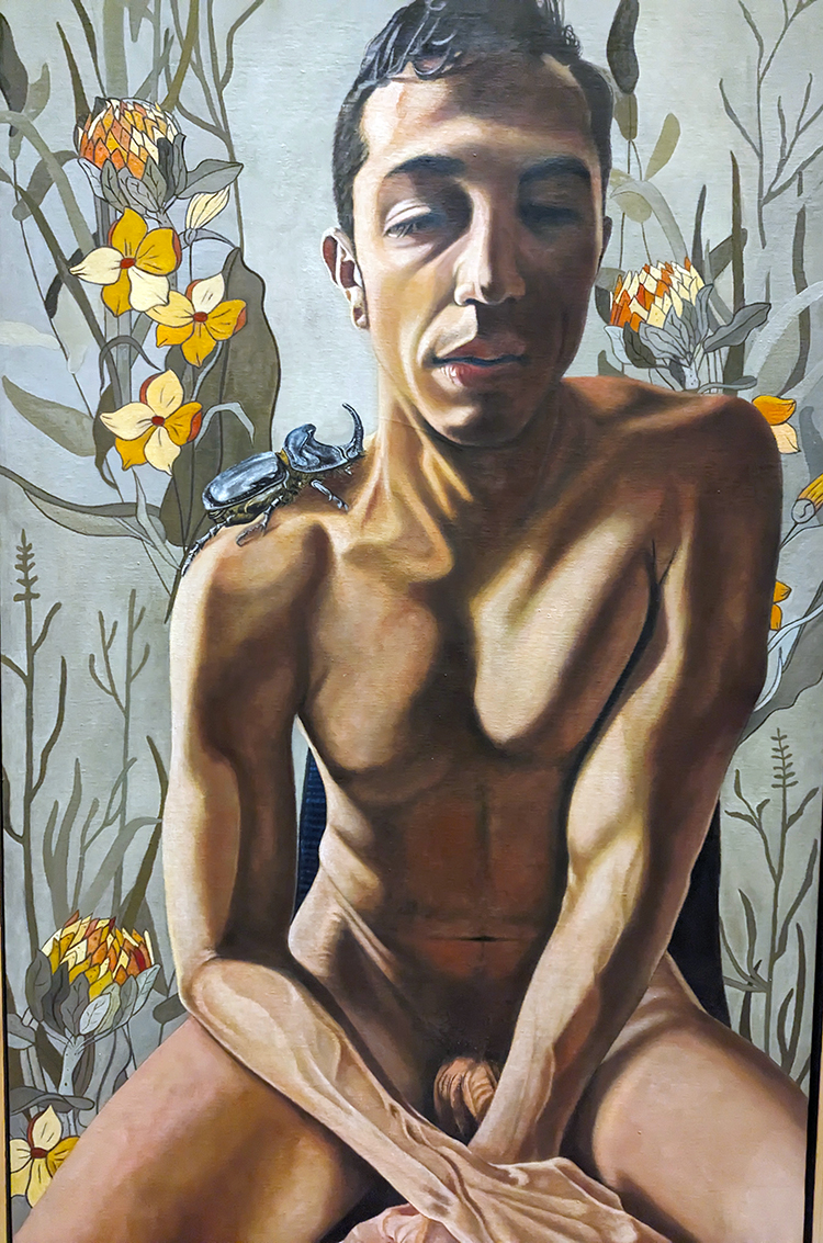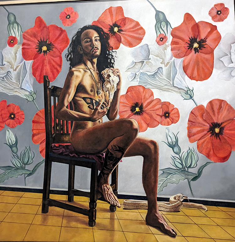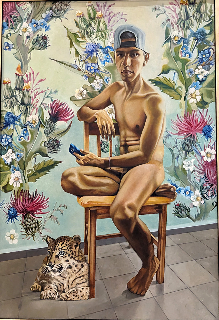 Bucio’s paintings often serve as protests against the societal imposed definitions of masculinity and femininity, blurring those roles. His sensually-posed nudes below are portrayed against florid backgrounds emphasizing femininity contrasted with the dangerous animals resting tamely at their sides.