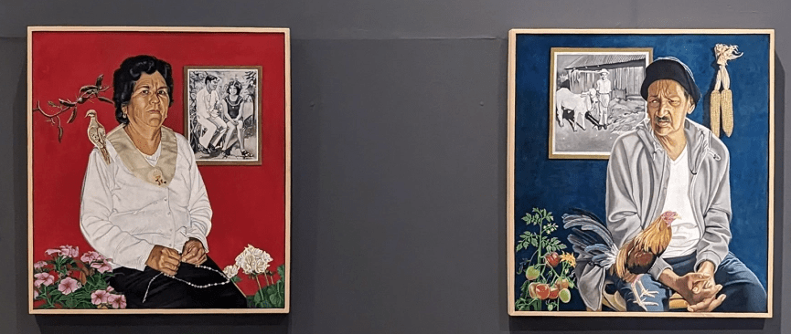 Another Michoacan artist, Santiago Bucio Carrillo, is featured in an exhibition titled “Air, Blood and Earth.” The paired portraits of his parents emphasize their differences. A peaceful dove perched on her shoulder, his mother appears to be piously praying on her rosary for their marriage, while his father looks most concerned about his fighting cock.