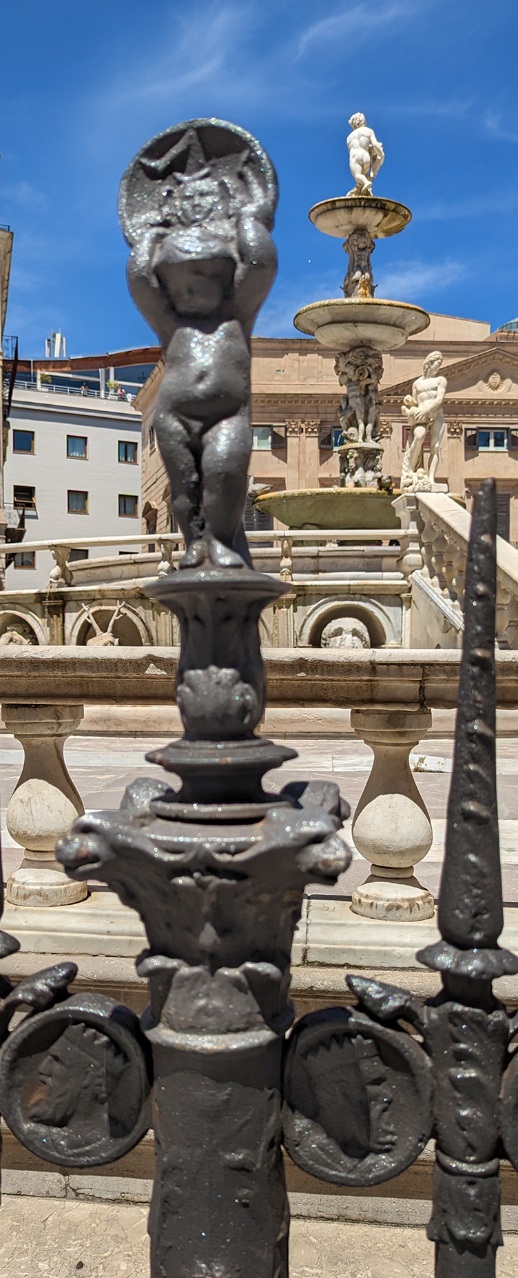 I have read that the figure crowning the fountain represents Genio di Palermo, a pre-Roman deity of sorts believed to assist with the saintly protection of the city. As Genio is perched up high on the top basin of the fountain, it’s easy to miss identifying him by his traditional pose with a large snake in the process of devouring his chest.
