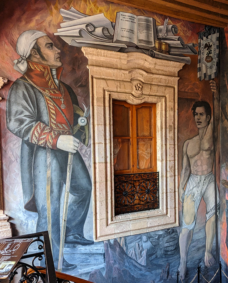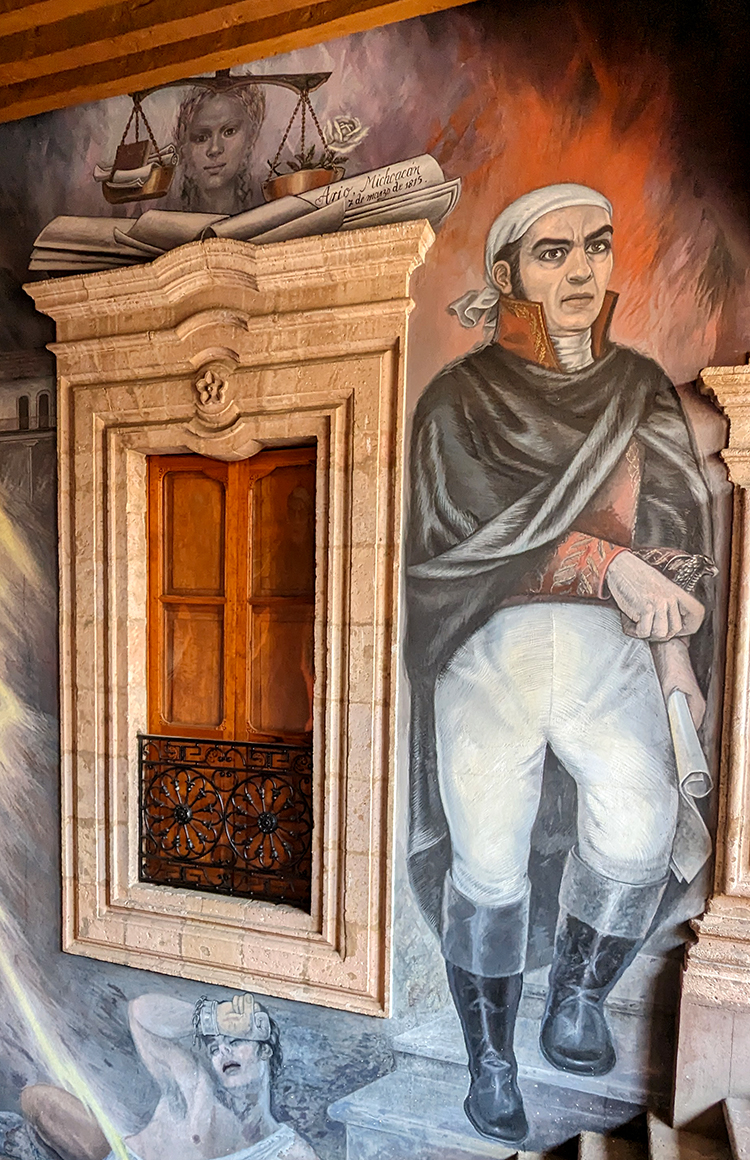 Inflamed by the fervor of revolt, Jose Maria Morelos dominates the stairwell of the former governmental headquarters for the Spanish city originally known as Vallodolid on the central plaza of his namesake city. In 1812, the building was repurposed to serve as a mint producing copper coins and postage stamps.