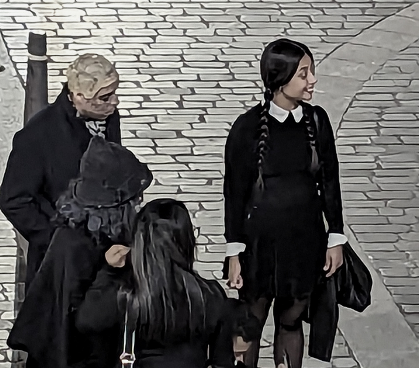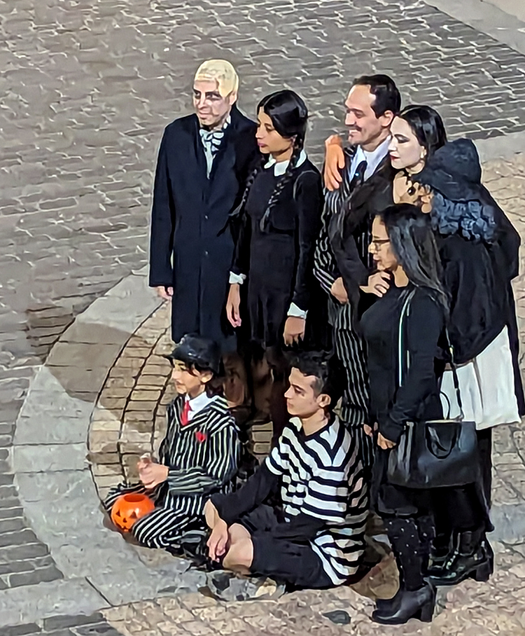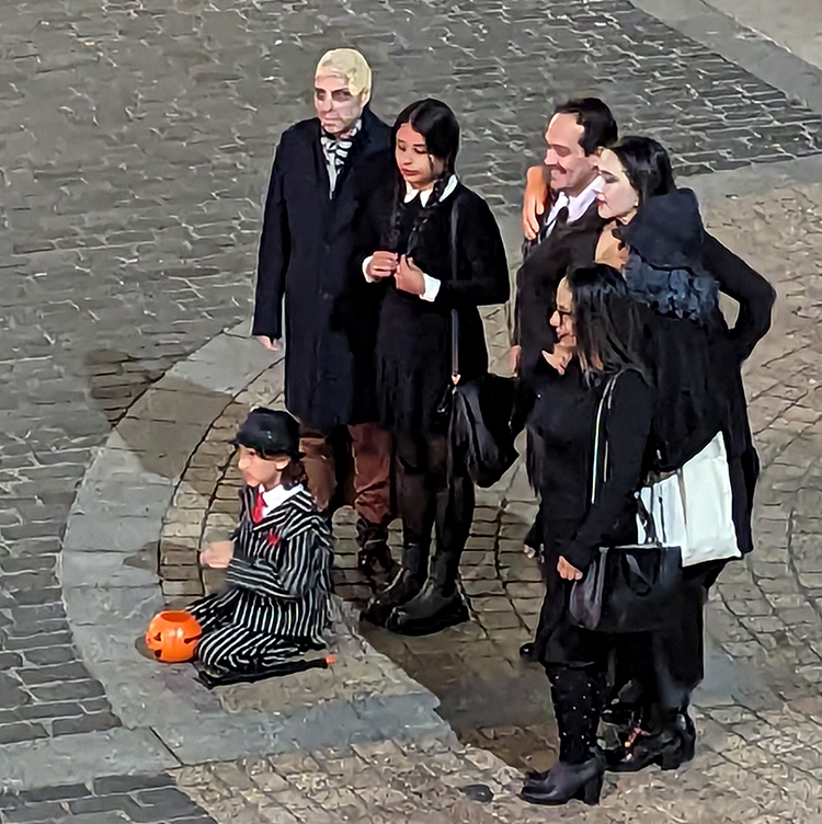 Groups of young people and a few costumed families crisscrossed the plaza. For devils, the Addams Family and handmaids, the photo op presented by posing in front of the Gothic-style façade proved irresistible.