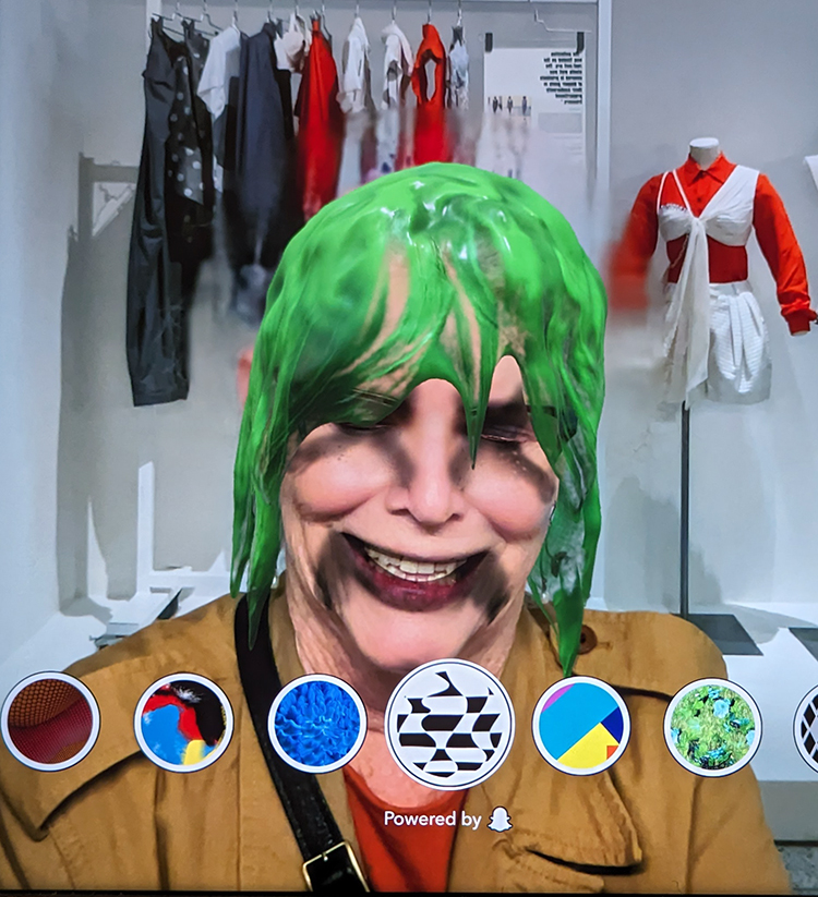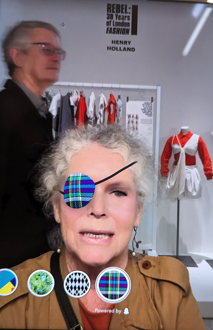 As for us, we’re not big on dressing up for Halloween or selfies. A computer program at The Design Museum in London a few weeks ago seduced us into breaking character. The screens transformed your face with makeovers appropriate for some of the fashions featured in “Rebel: 30 Years of London Fashion.”