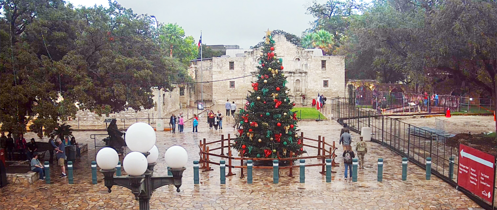 Above: Screen grab from the Alamo Plaza Live Cam on November 30, 2023, shows large live oak trees framing the view of the Alamo.