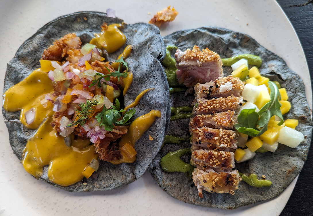 We sampled two ceviches. The fresco was a bit fruity for out tastes, but the Peruano with tuna in leche de tigre was just right. Chango’s tuna with a seared crust of peanuts and sesame seeds is recommended, and the pictured tacos are shrimp in a coconut sauce and tuna tiradito.