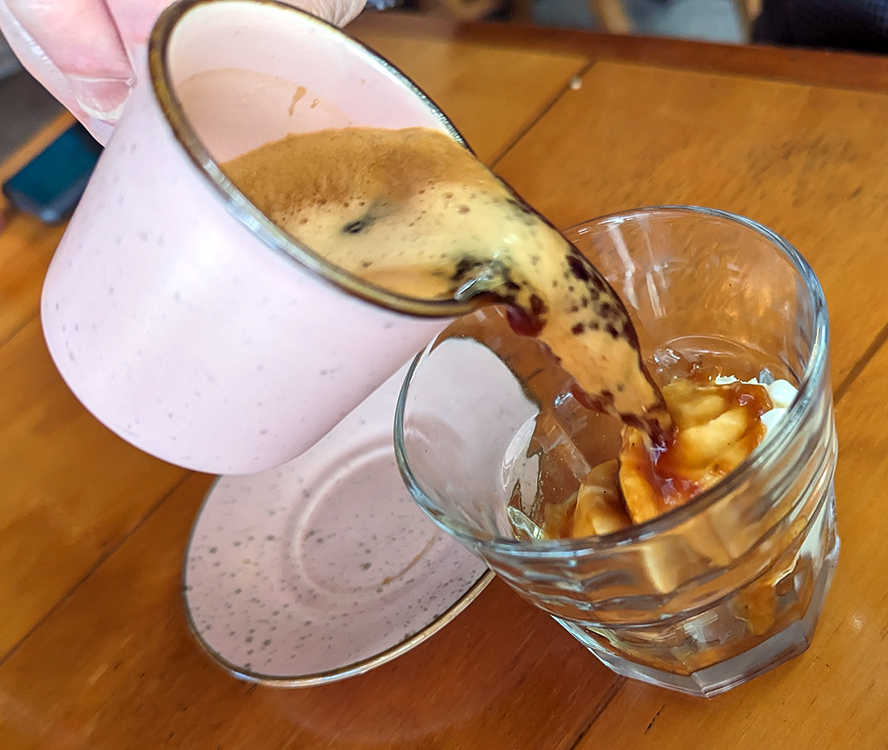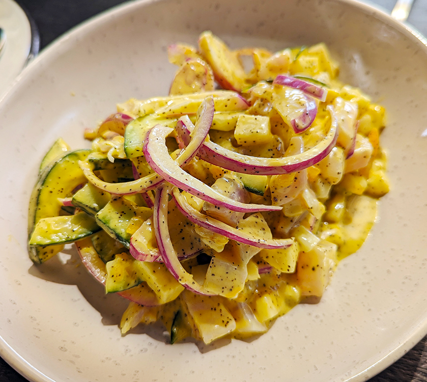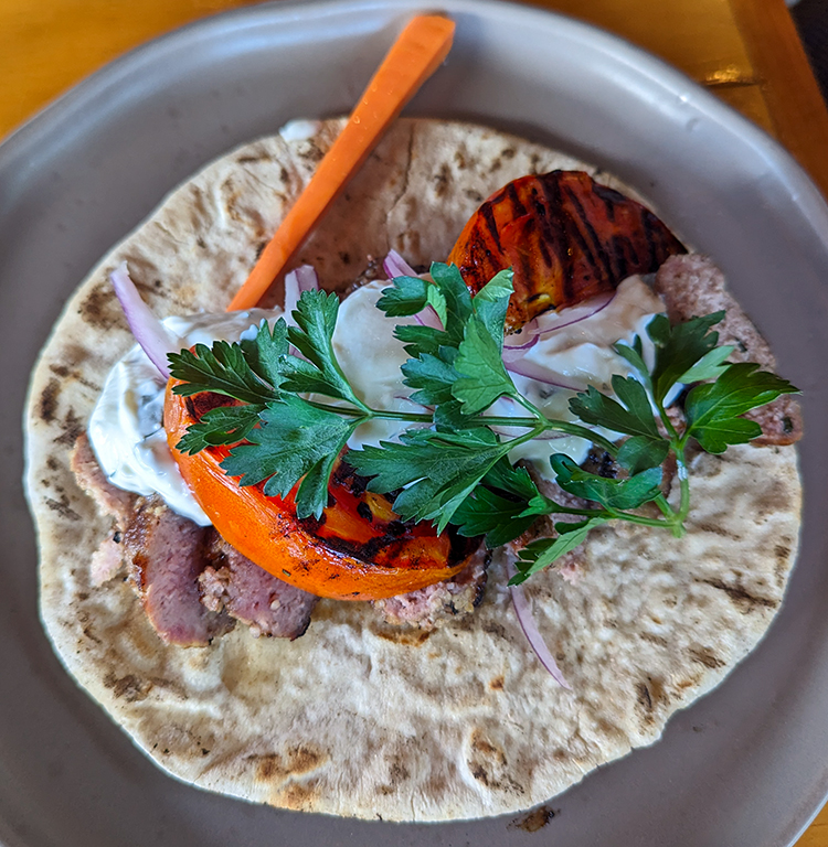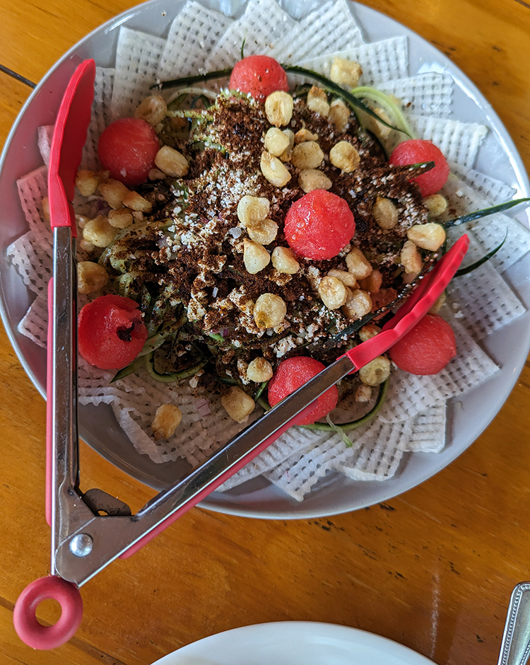 A long hike and with an easy-to-miss stairway entrance, Cielo Cocina Fusion is a comfortable neighborhood spot with some out-of-the-ordinary dishes. We enjoyed a watermelon-ball summer salad, portobello noodles with a mountain of sauteed vegetables and gyros. And then continued to relax with a creme brulee and an affogato.