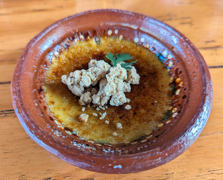 Okay. Okay. Enough history. Both the food and your interest are getting cold. Mid-August is the beginning of the season when fresh poblano chiles, walnuts and pomegranates all are available for preparing chiles en nogado. La Conspiracion’s patriotic presentation reflected the colors of the Mexican flag with a plump roasted poblano pepper filled with spiced ground meat and dried fruits and topped with a creamy pecan sauce instead of the traditional walnut one.