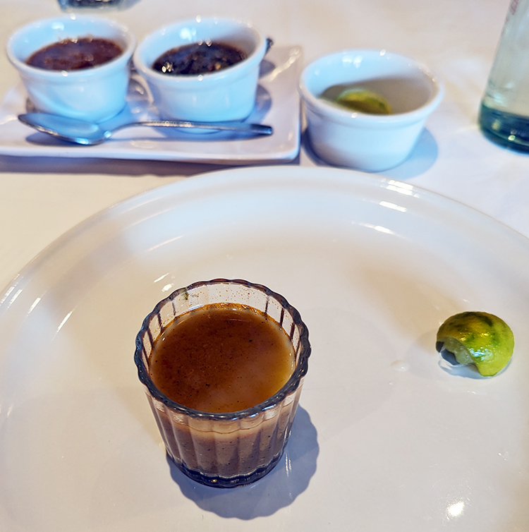 An amuse-bouche greeted us upon arrival at Chango Restaurante. A nice spicy gazpacho with a “z.” But our faces fell a bit when our margaritas arrived. Frozen. But, if one is going to sip frozen, this one was great. Plus, it trained us to specify pocas rocas nowadays, even deep in the heart of Mexico. On a later visit, Chango’s bartender did prove he knew how to a shake up a good one.