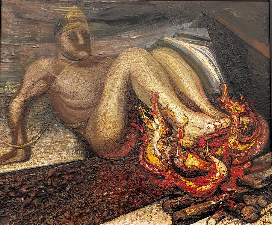 Above, left to right: “Cuauhtemoc,” David Alfaro Siqueiros, 1946; and “The Waiting Room,” Joey Fauerso, 2020